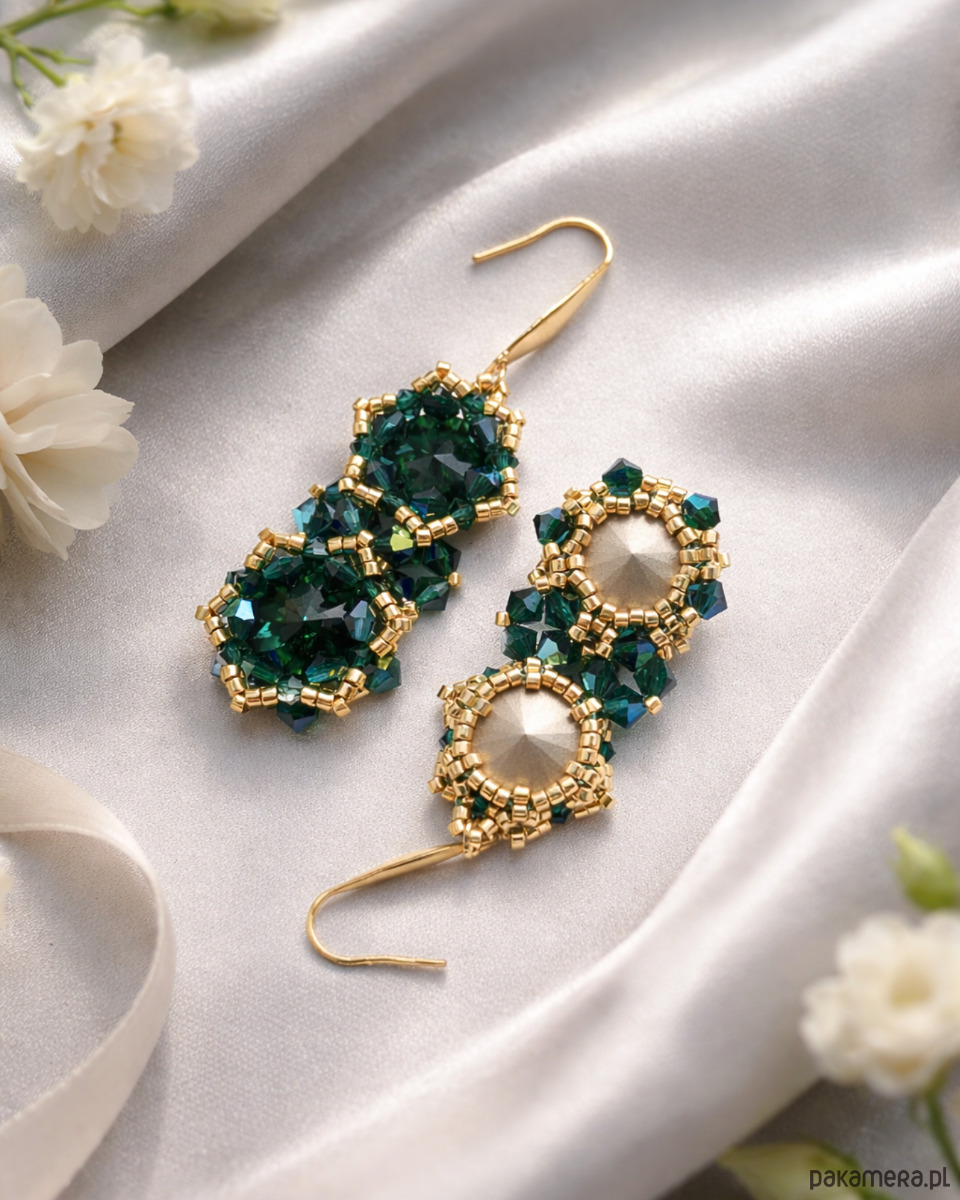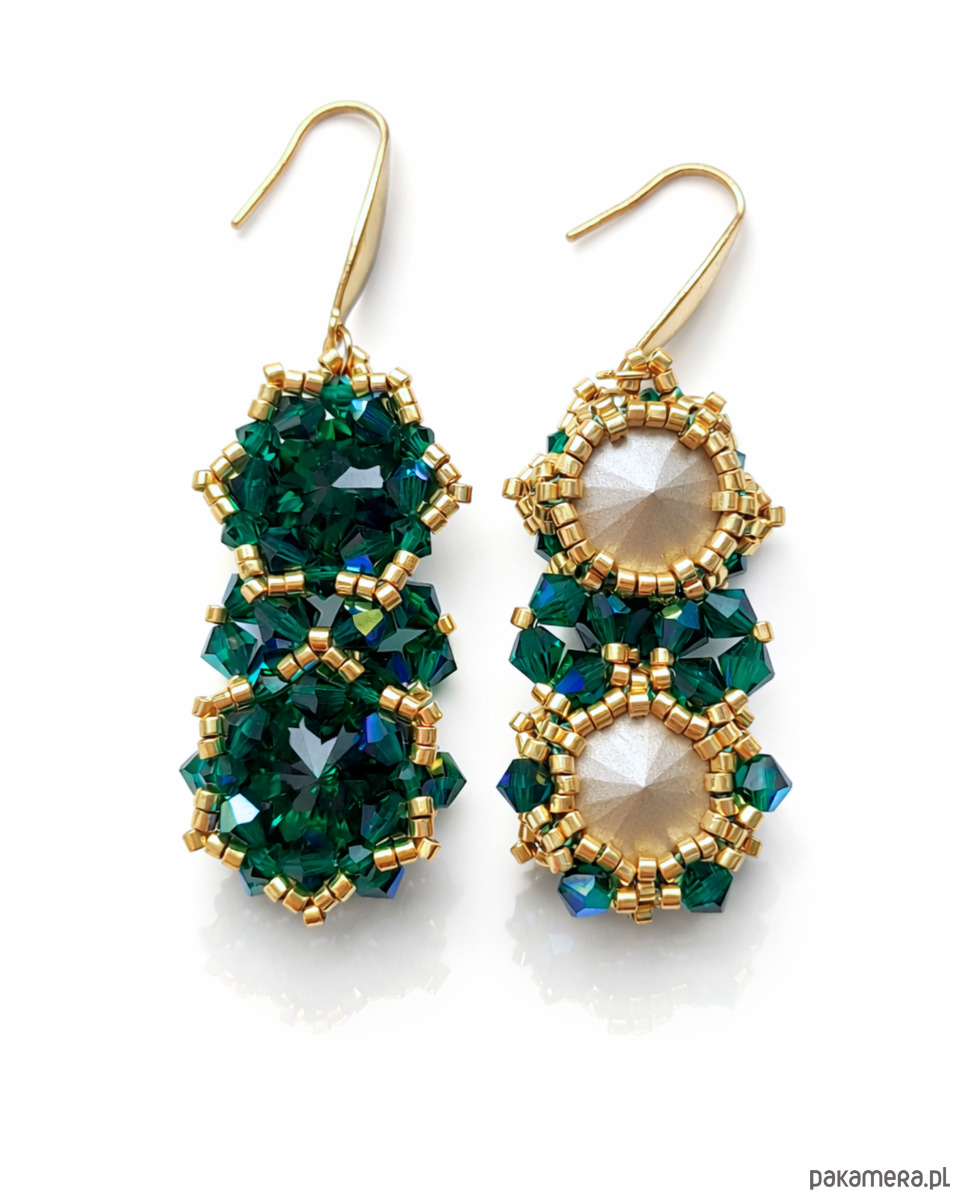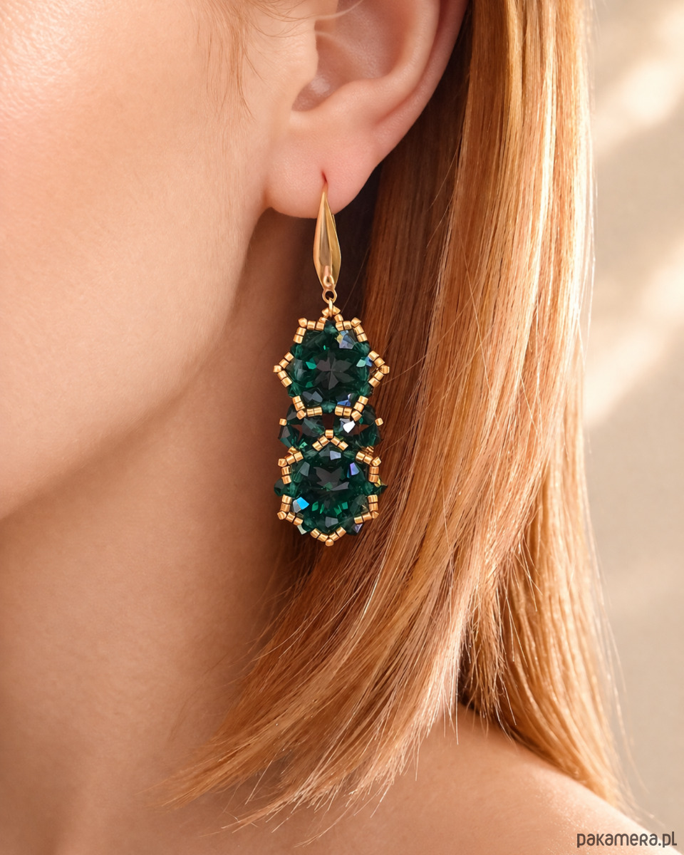 Każdy kolczyk składa się z dwóch kryształów Preciosa Rivoli Maxima w kolorze Emerald, które tworzą harmonijną, pionową kompozycję. Szmaragdowa zieleń, pełna życia i blasku, pięknie odbija światło, nadając biżuterii luksusowego charakteru.