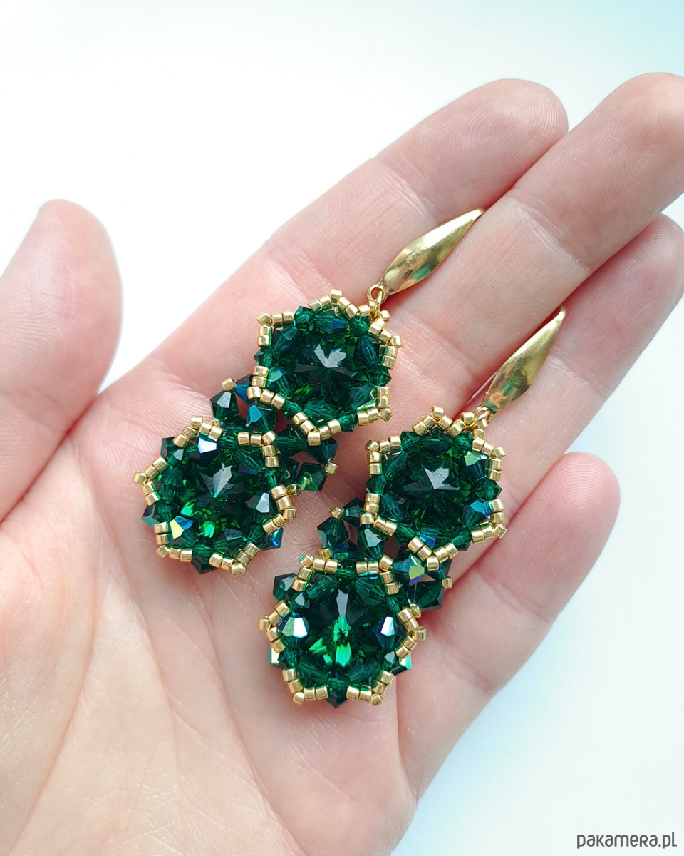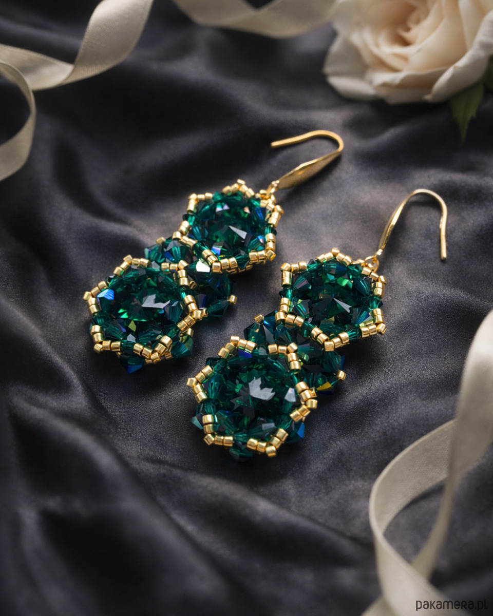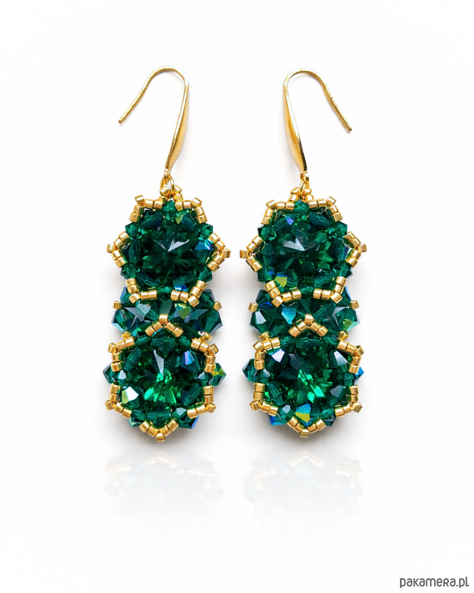 Każdy kolczyk składa się z dwóch kryształów Preciosa Rivoli Maxima w kolorze Emerald, które tworzą harmonijną, pionową kompozycję. Szmaragdowa zieleń, pełna życia i blasku, pięknie odbija światło, nadając biżuterii luksusowego charakteru.