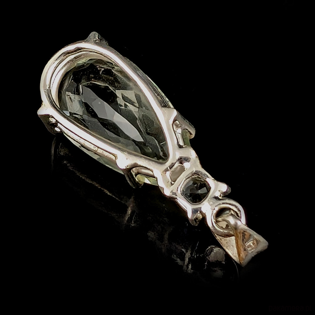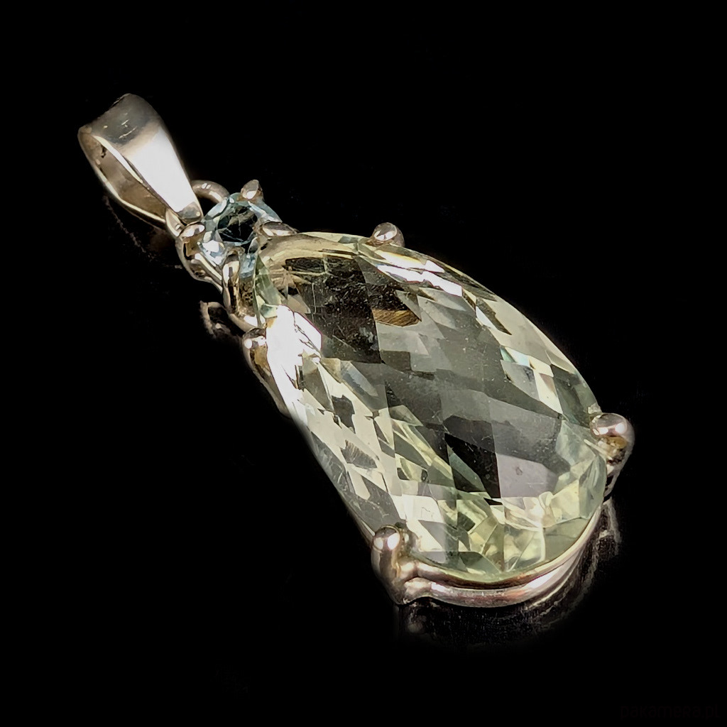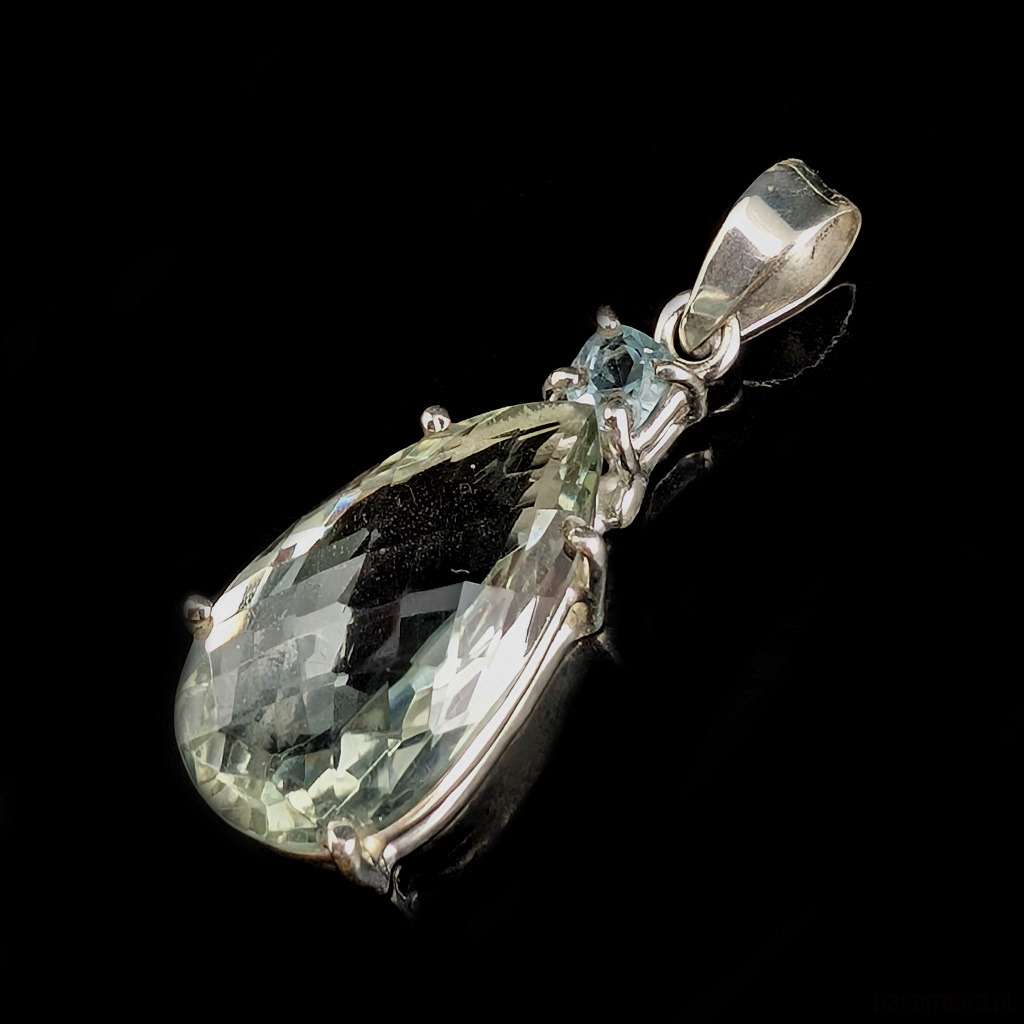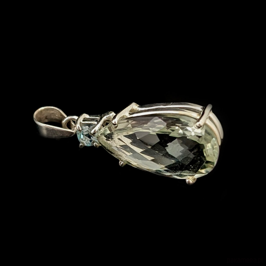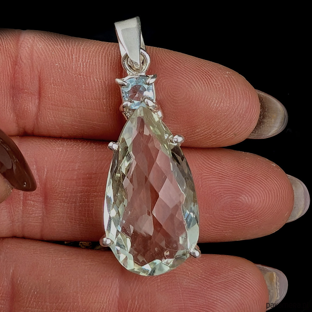 Wisior wykonany ze srebra próby 925 oraz zjawiskowego zielonego kryształu ametystu o precyzyjnym szlifie. Przepięny okaz, któremu towarzyszy niebieski topaz. Wymiary oprawy 32 x 15 mm. Długosć max 43 mm. Waga 8,5 g. Wykonany przez dostawcę kamieni. Wisior zostanie wysłany w ozdobnym pudełeczku.