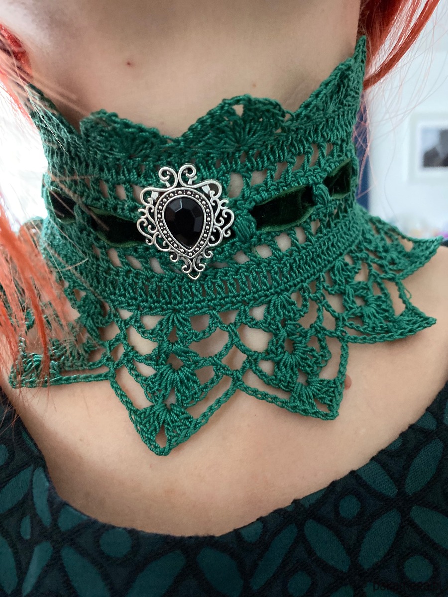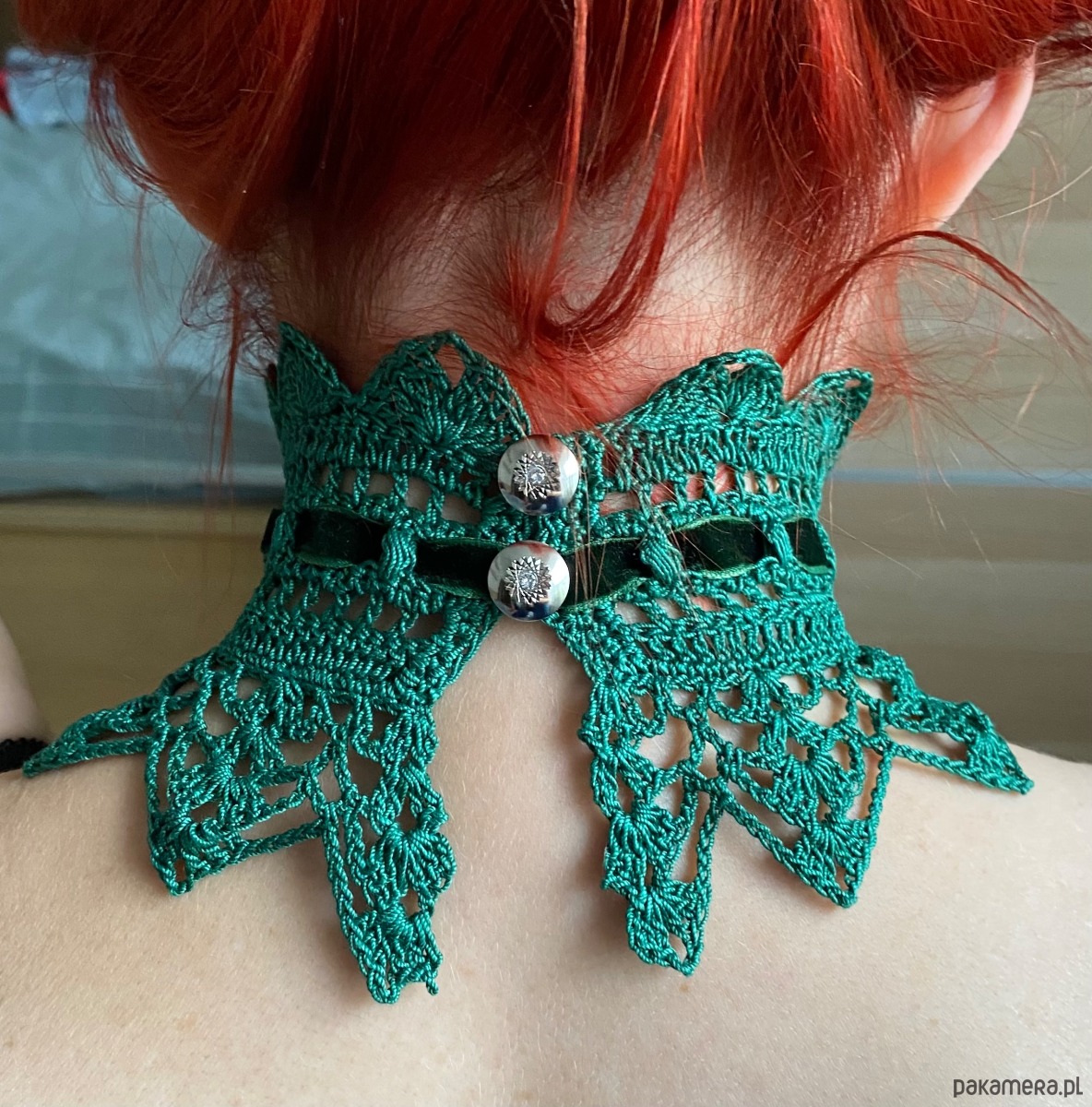 Koronkowy choker w kolorze butelkowej zieleni, przyozdobiony wiktoriańskim akcentem i przepleciony zieloną aksamitką.Cudowny!Jedyny w swoim rodzaju.💚