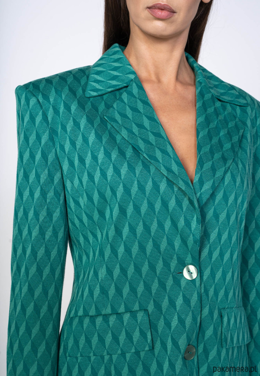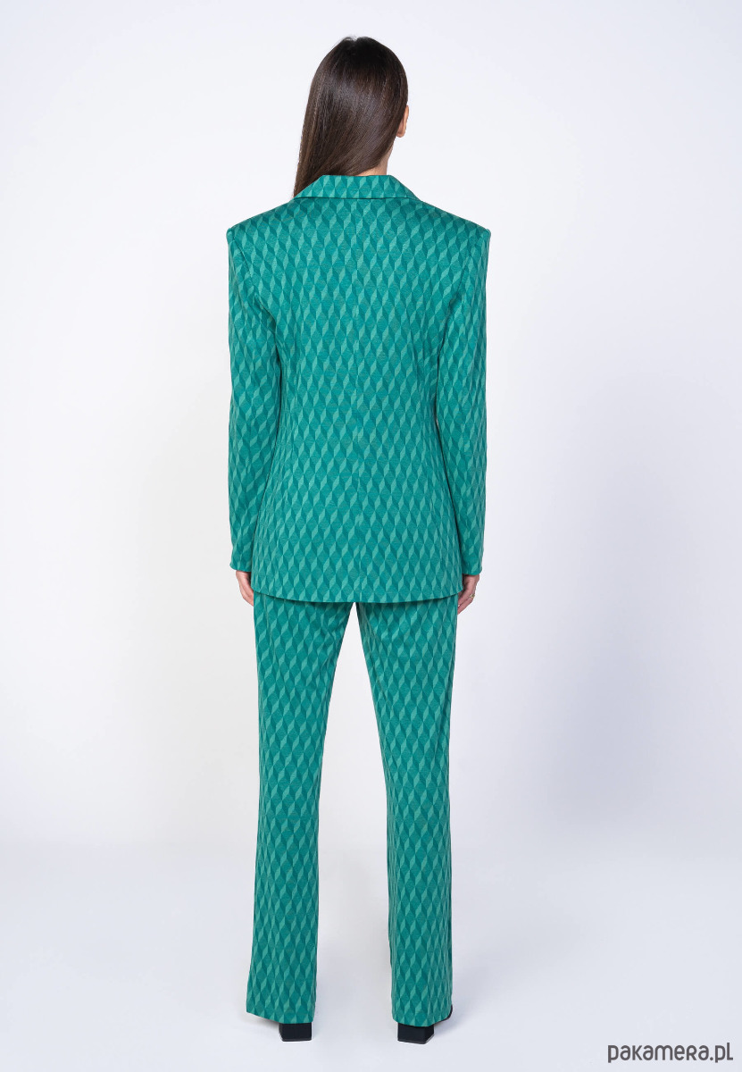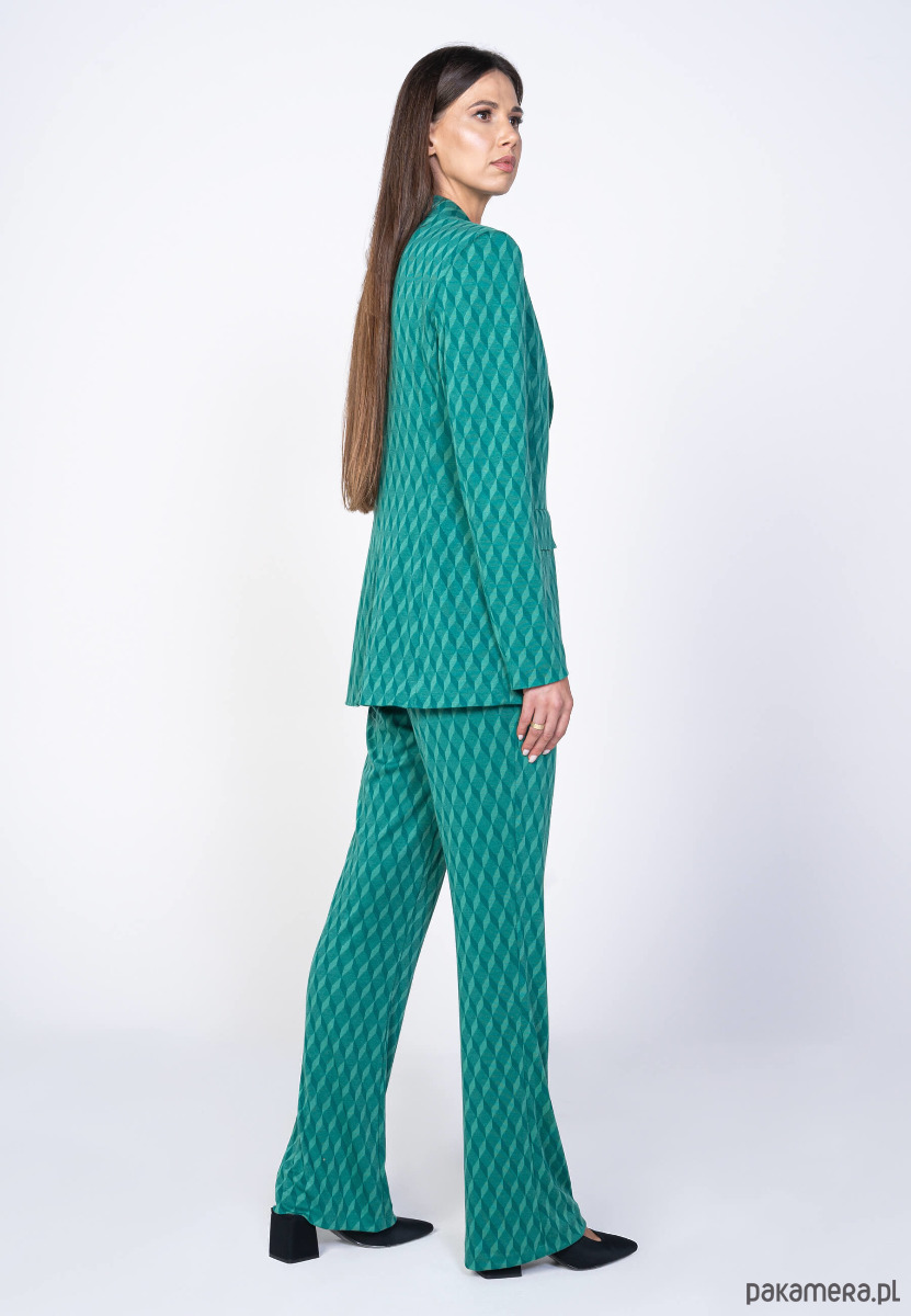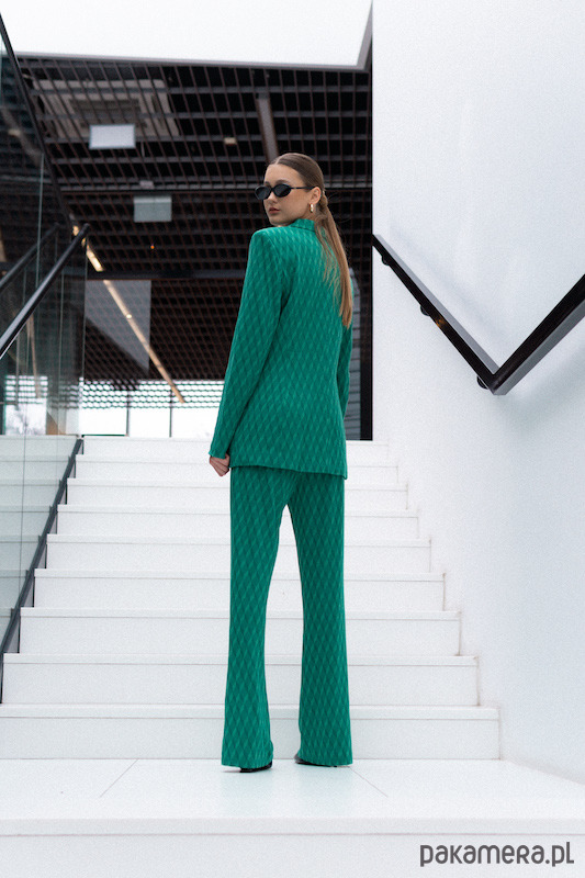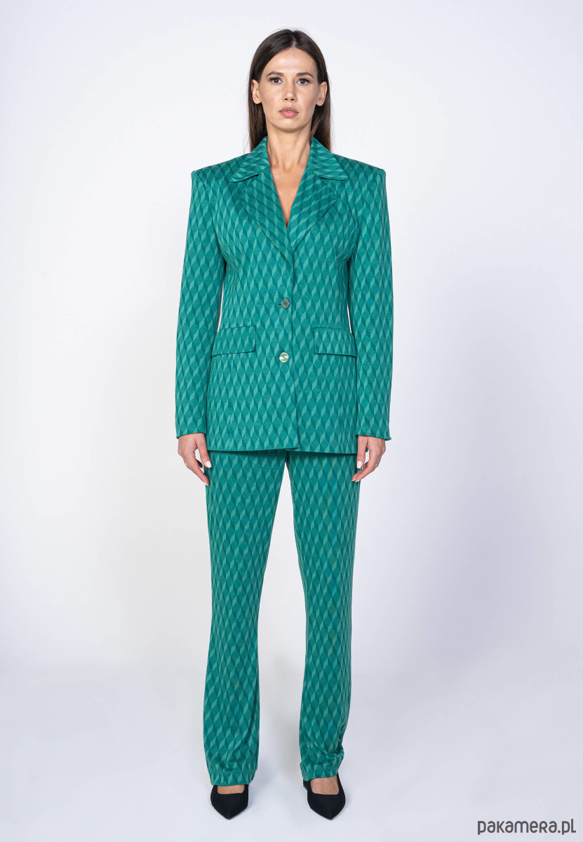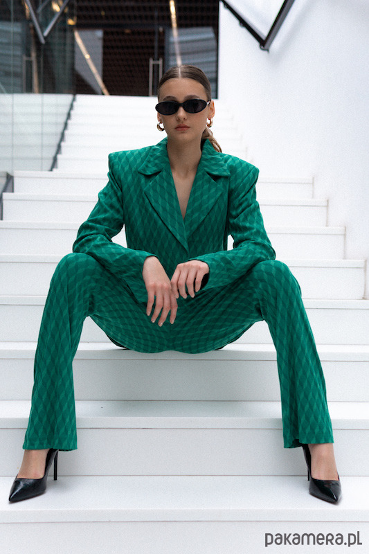 Przedstawiamy Wam nasz zielony garnitur damski. Przenieś się do artystycznej sfery i poczuj prawdziwą WOLNOŚĆ. Geometryczny wzór sprawi, że Twój look będzie przepełniony fantazją, a luźny krój doda Twojej stylizacji niezwykłej swobody.