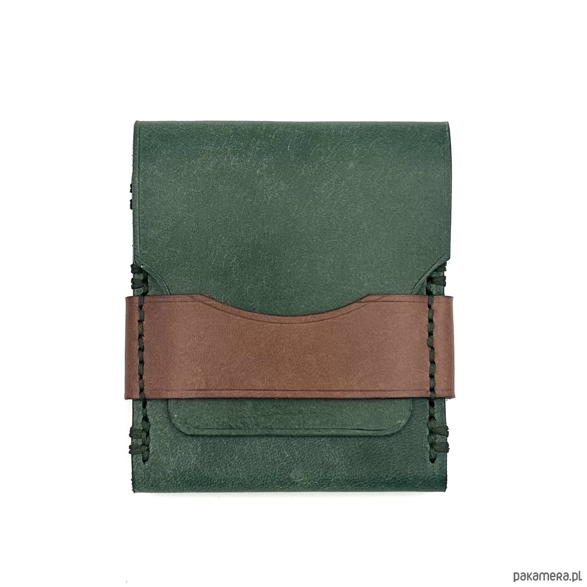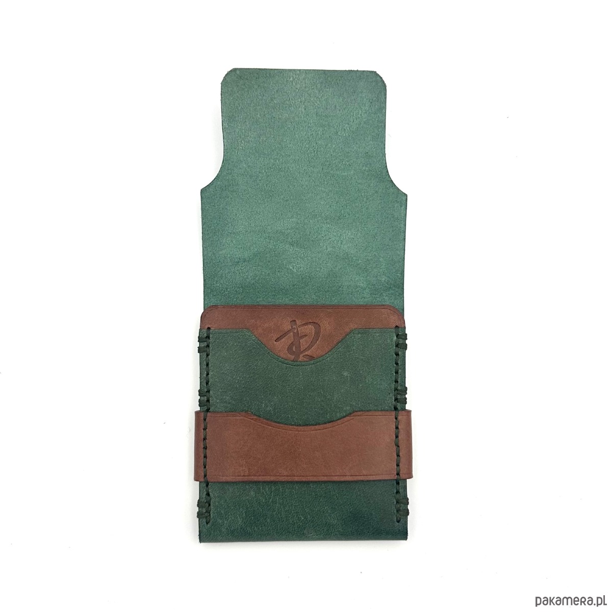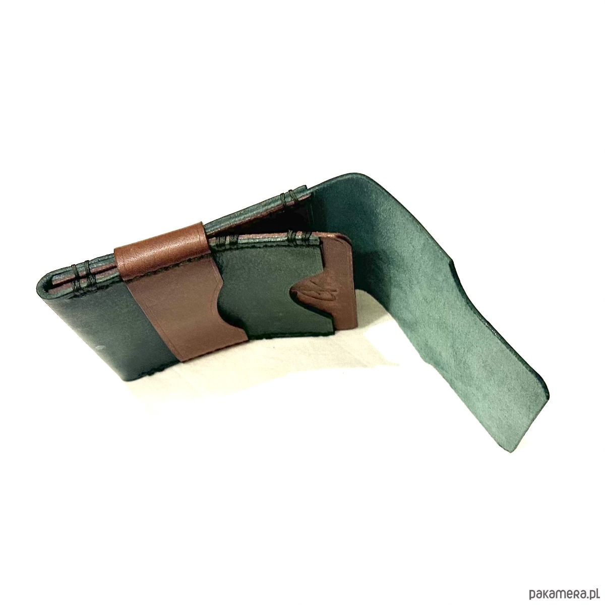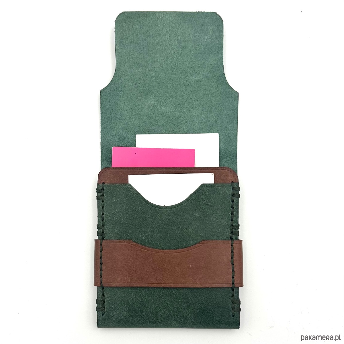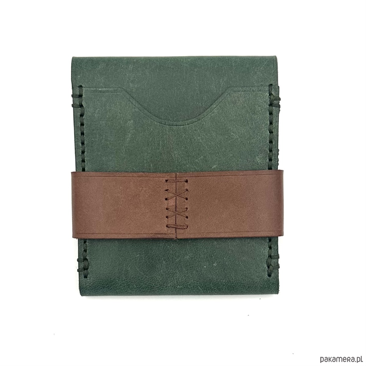 Zielony portfel z dodatkiem brązu skórzany na karty.