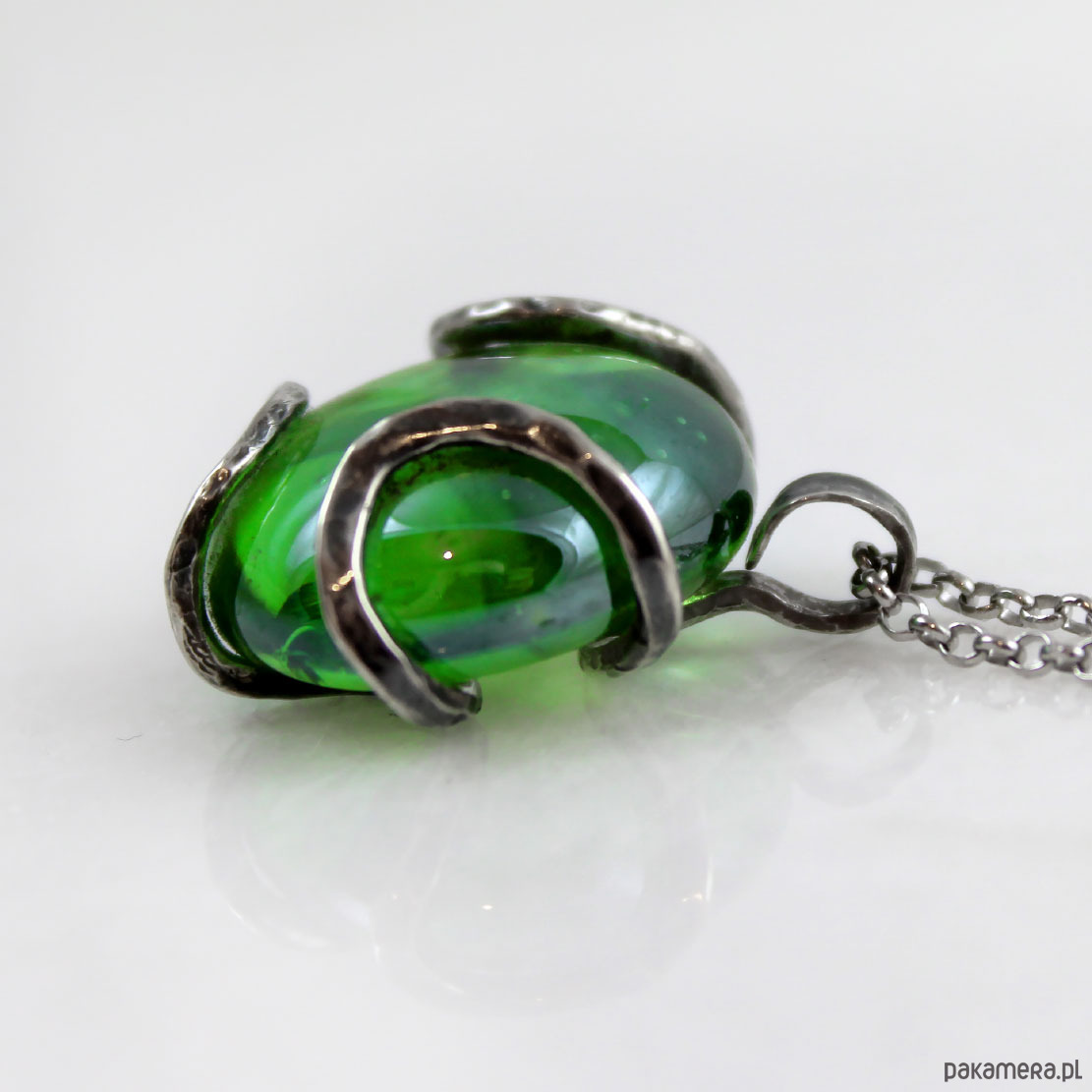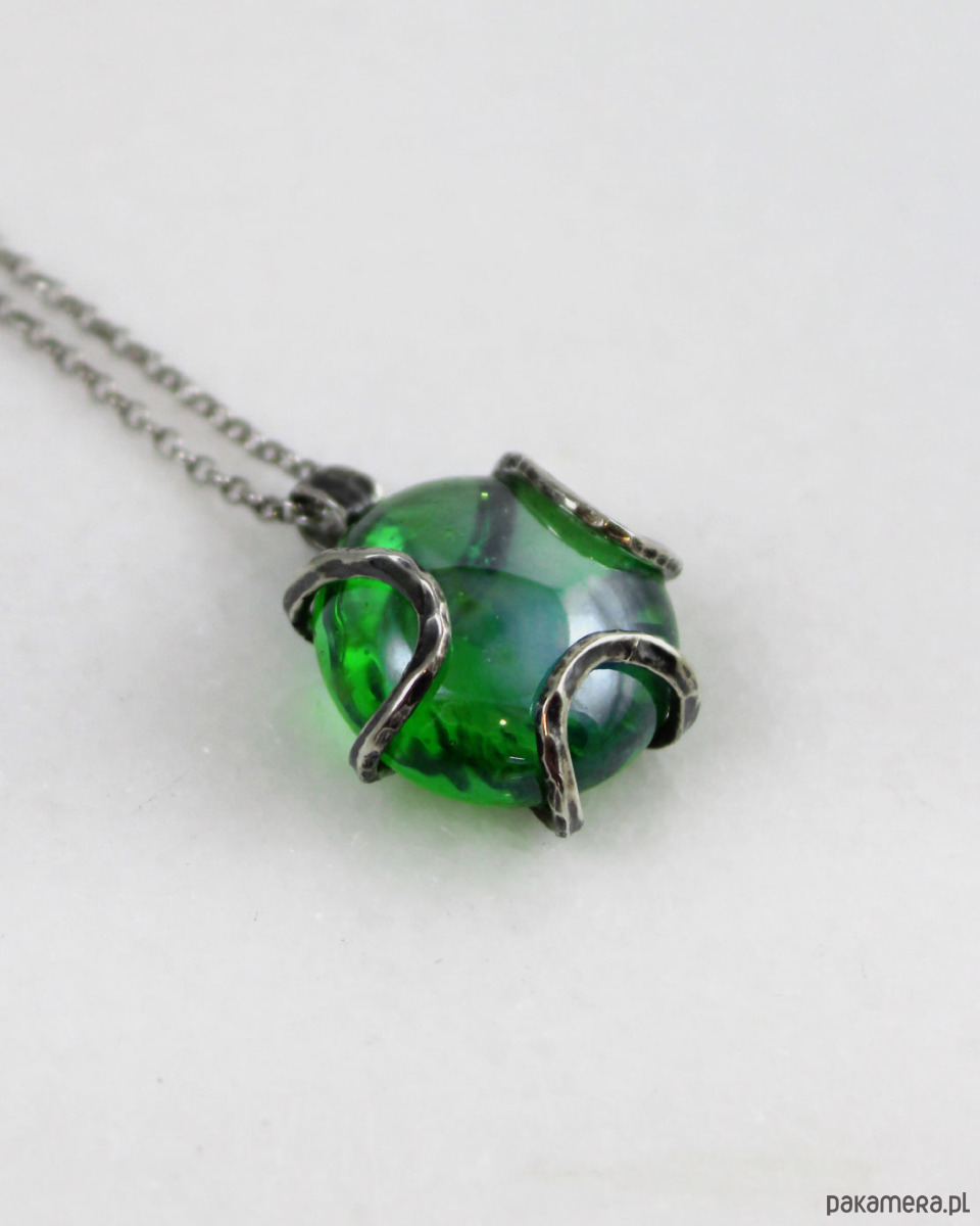 Wisior został wykonany ręcznie z nieregularnego czarnego szkła witrażowego i srebra. Lekko patynowany w procesie oksydacji (bez użycia sztucznych barwników). Całkowita długość to ok 2,5 cm. W komplecie srebrny łańcuszek do zawieszenia.