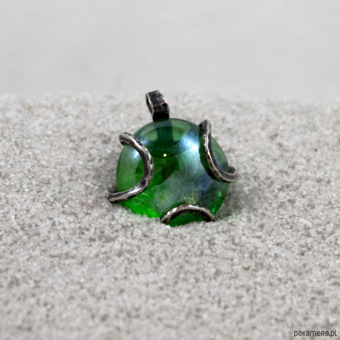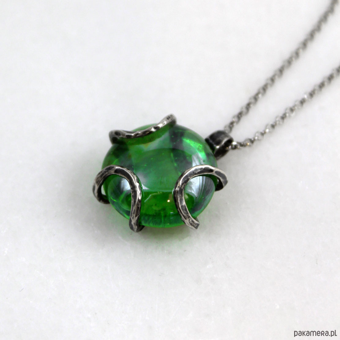 Duży wisior ze szkła witrażowego w srebrnej oprawie.