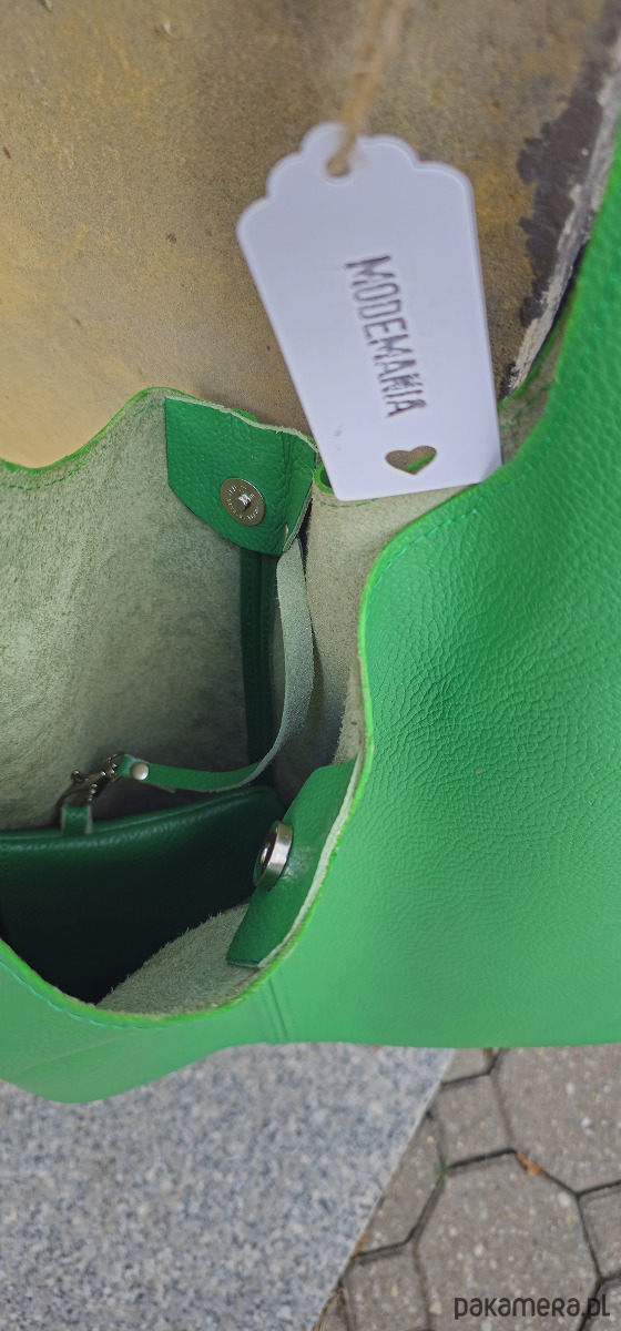 Torba na ramię wykonana ze sztywnej skóry naturalnej w soczystym odcieniu zieleni.