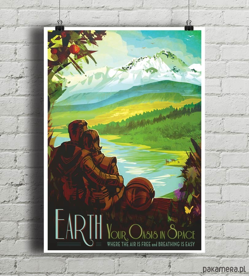 Plakat w stylu vintage przedstawiający planetę Ziemia, reklamowaną sloganem "Twoja oaza w kosmosie. Gdzie powietrze jest darmowe a oddychanie łatwe".