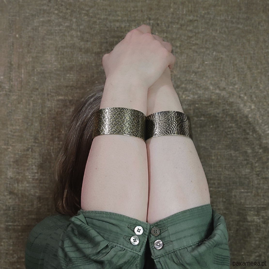 Wzór jest lekko podkreślony ciemną patyną uzyskaną w procesie oksydacji (bez użycia sztucznych barwników). Nieznaczne ciemnienie metalu na skutek użytkowania jest procesem naturalnym (należy unikać długotrwałego kontaktu bransolety z wilgocią).