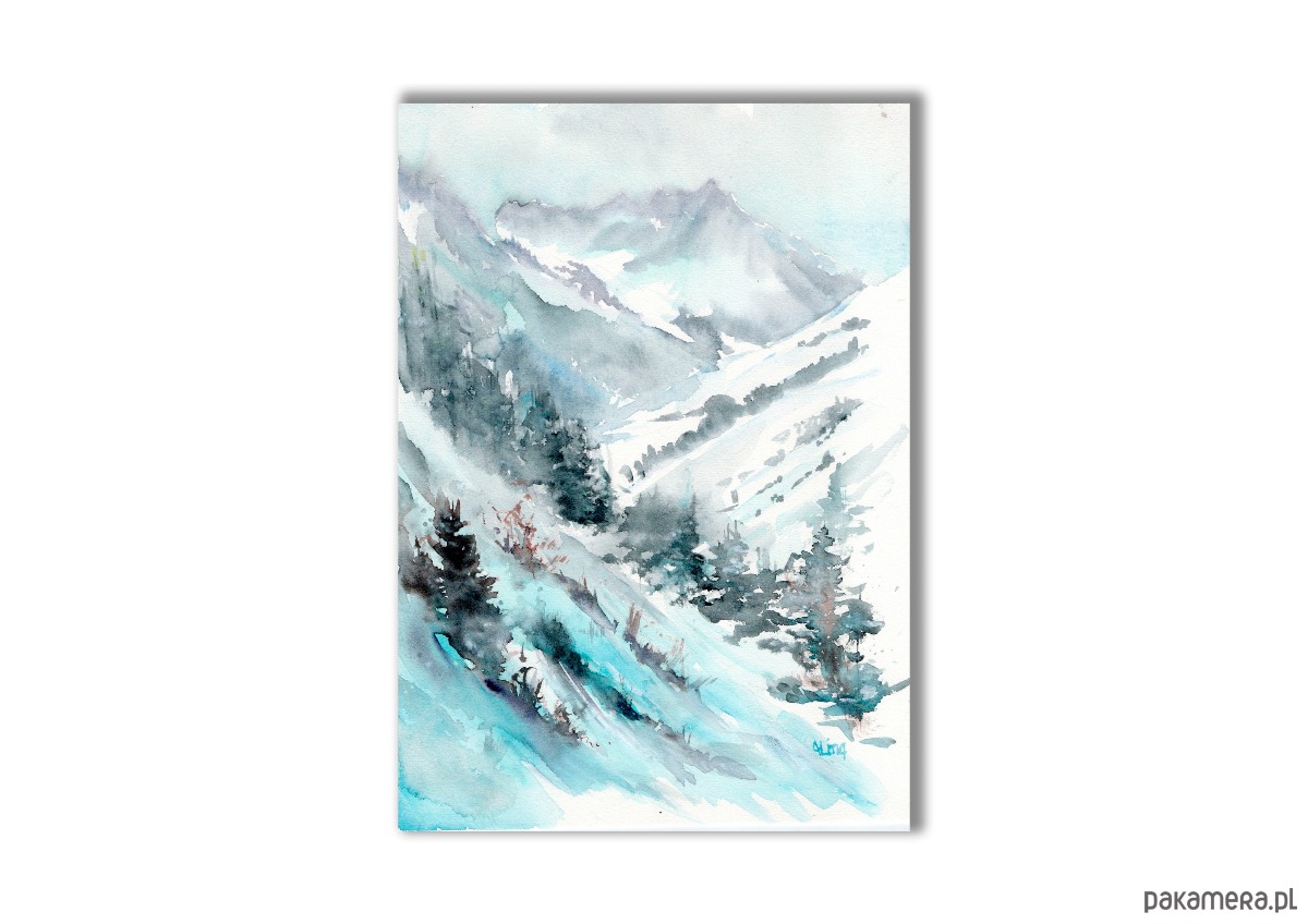Ta wyjątkowa akwarela przyniesie Ciebie w serce ośnieżonych gór, oferując chwilę wytchnienia i spokoju. Pozwól sobie na codzienną dawkę inspiracji, patrząc na ten nastrojowy pejzaż, który pobudza wyobraźnię i emocje.