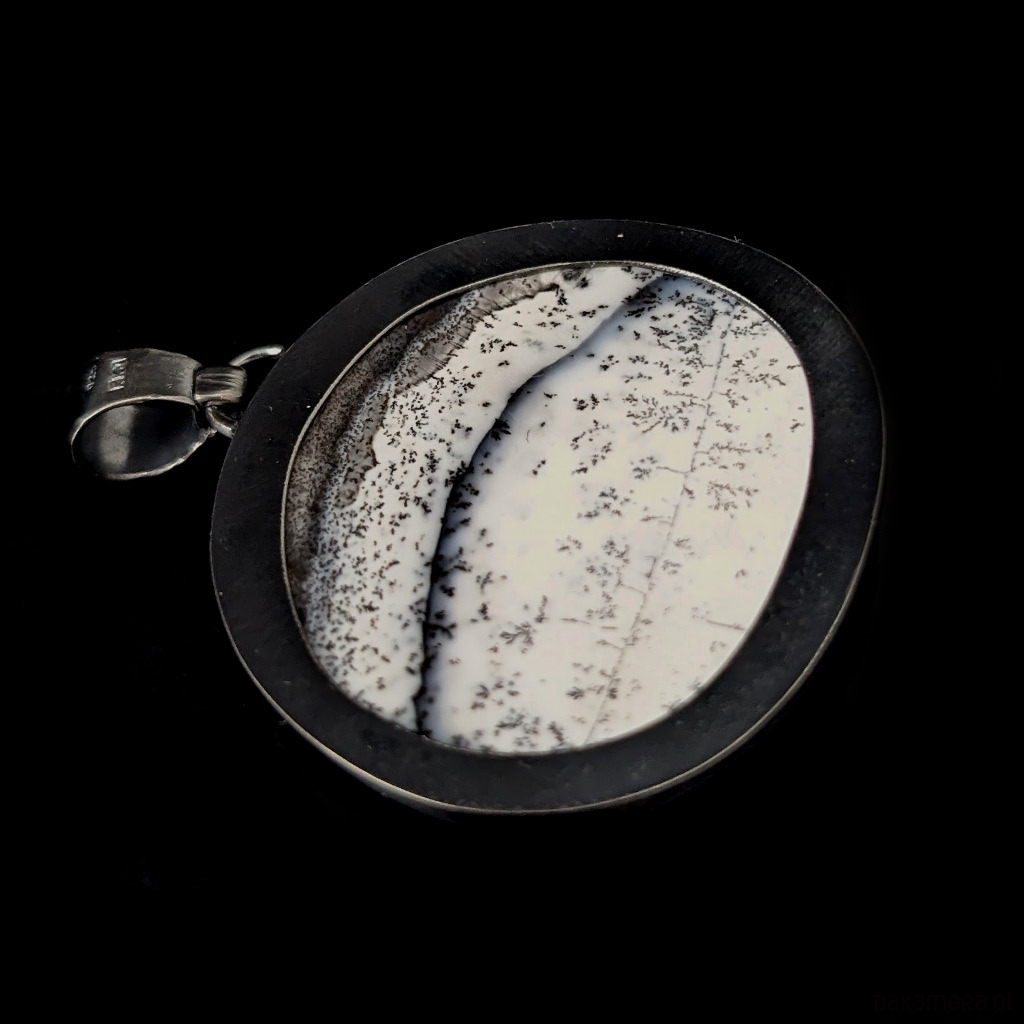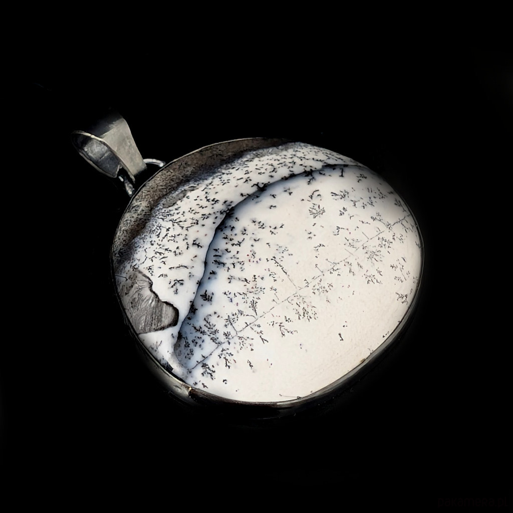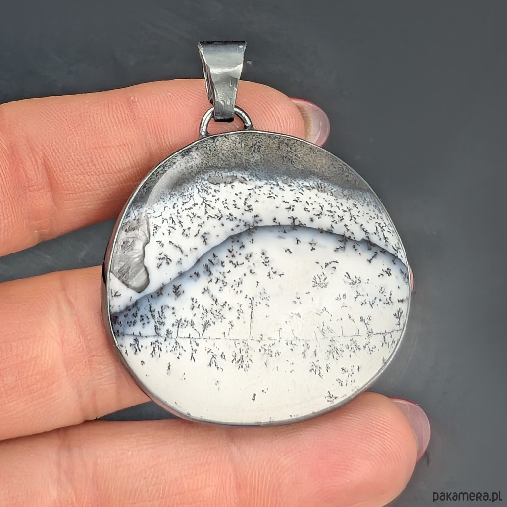 Piękny, okazały agat dendrytowy oprawiony w oksydowane srebro próby 925. Wymiary oprawy 42 x 38 mm. Z krawatką 52 mm. Waga 16 g. Wisior wysłany w ozdobnym pudełeczku, polecam z pierścieniem do kompletu.