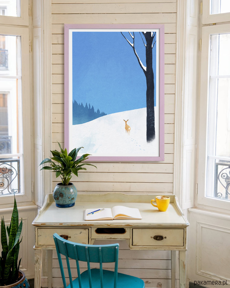 Plakat przyrodniczy "Zima w lesie / Sarna na śniegu" to baśniowa magia zimowego krajobrazu. Na plakacie samotna sarenka zostawia delikatny trop na śniegu w ciszy wciąż śpiącego lasu. Zimowa grafika wypełniona jest idyllicznym spokojem, niemal jakby na moment czas się zatrzymał. Zimowe grafiki ozdobią ściany niezależnie od aury panującej za oknem.
