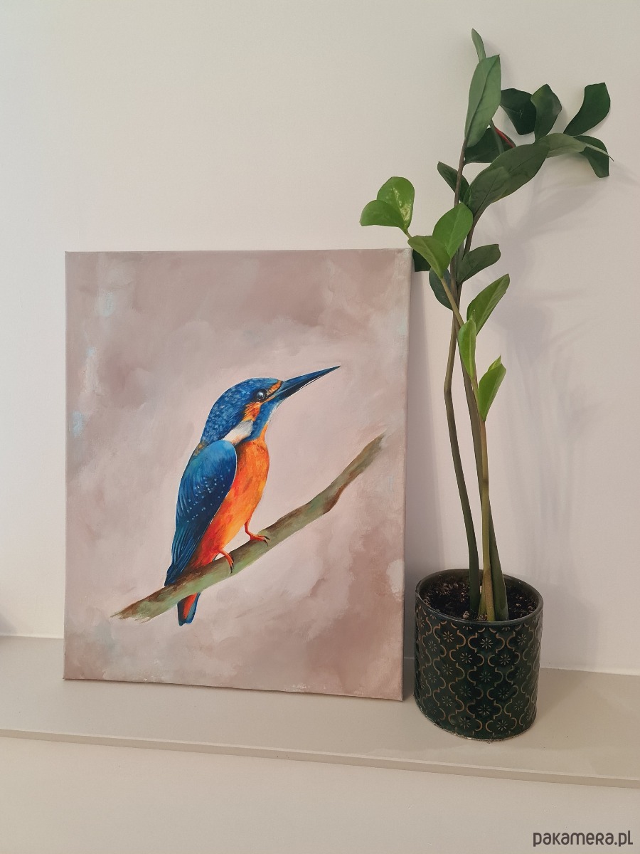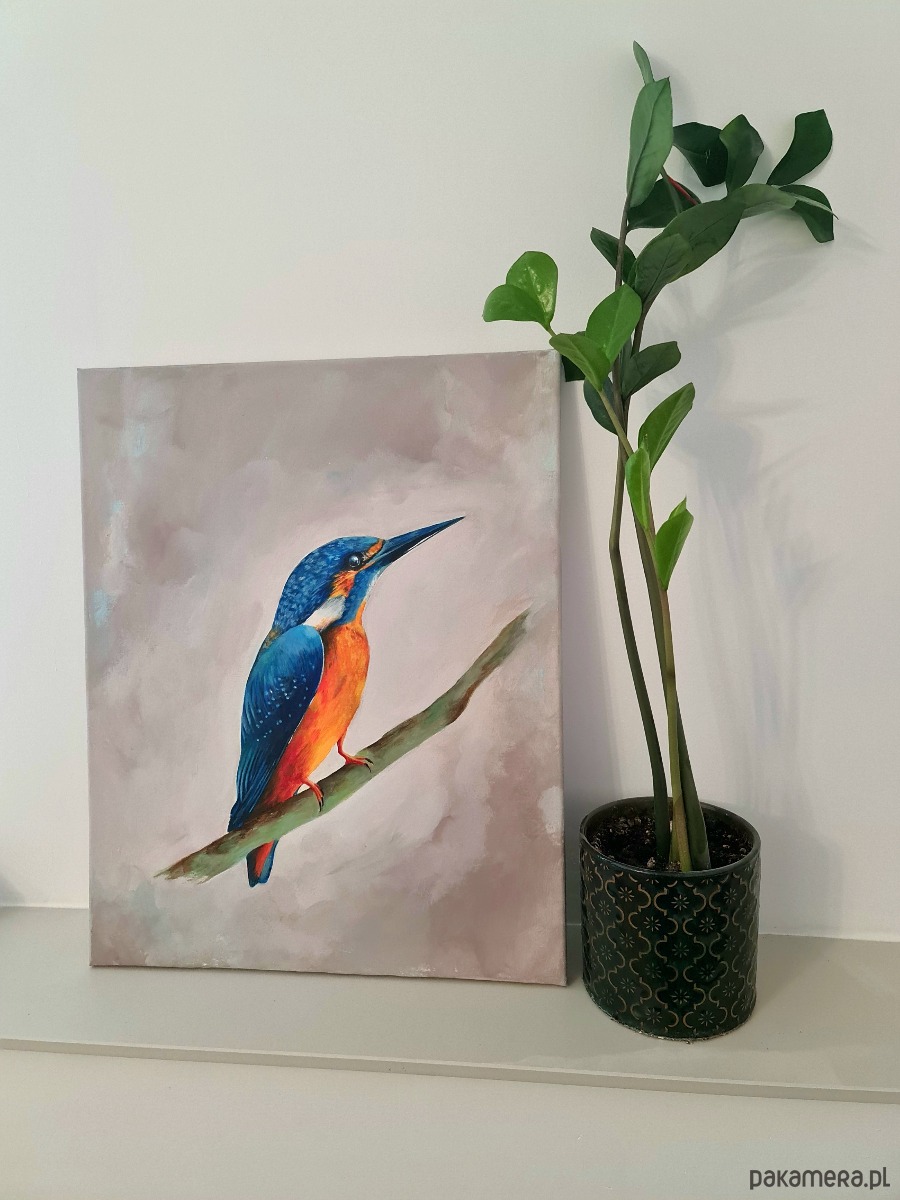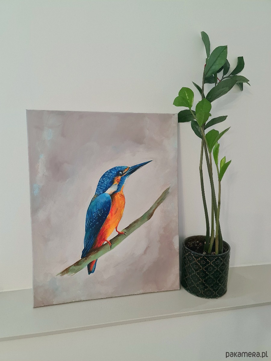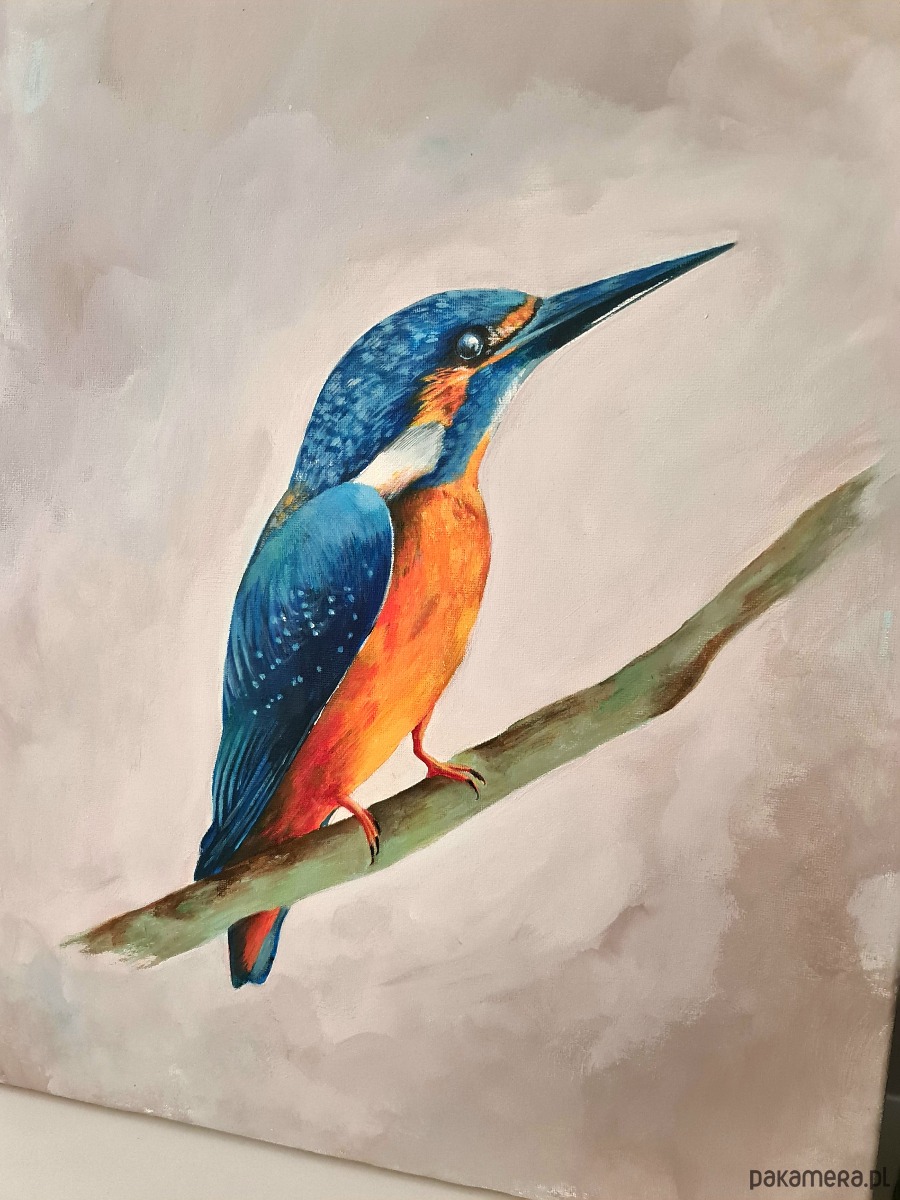Zimorodek na płótnie - praca wykonana profesjonalnymi farbami Renesans na podobraziu bawełnianym.