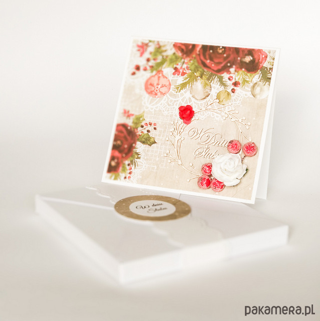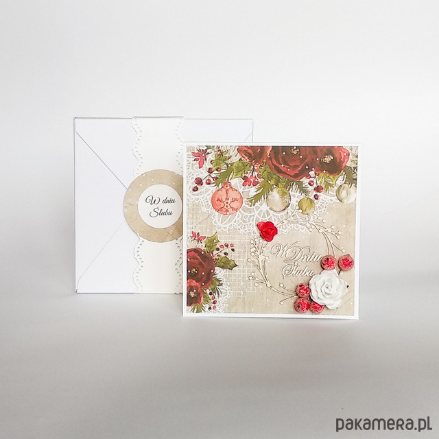 Elegancka karta ślubna, nawiazująca do zimowej scenerii wesela. W komplecie pudełeczko-koperta 3d z ozdobną opaską.