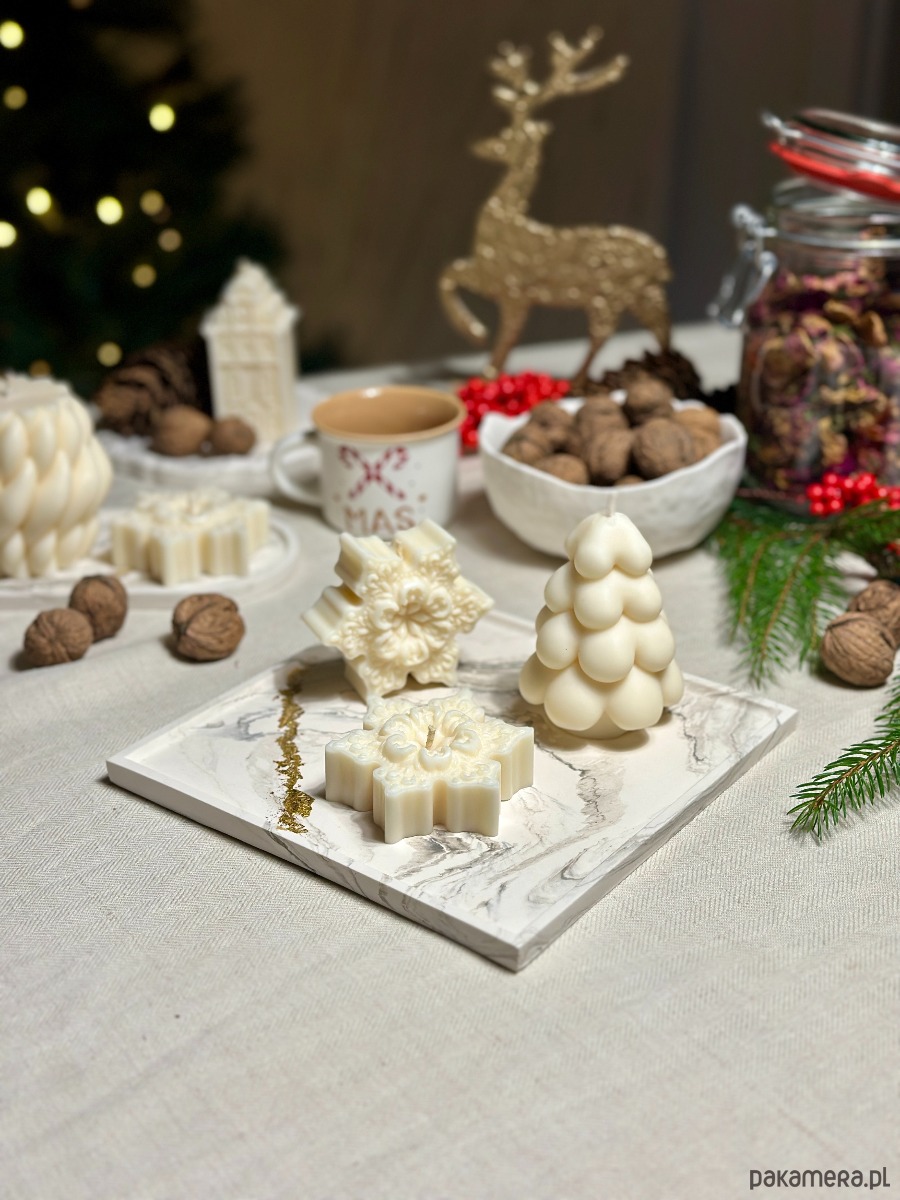 Dopełnieniem zestawu są świece sojowe, stworzone z naturalnego wosku, bez parafiny i zbędnych dodatków. Każda z nich ma estetyczny, pełen detali kształt zimowy – idealny do świątecznych aranżacji i nastrojowego oświetlenia wnętrza.