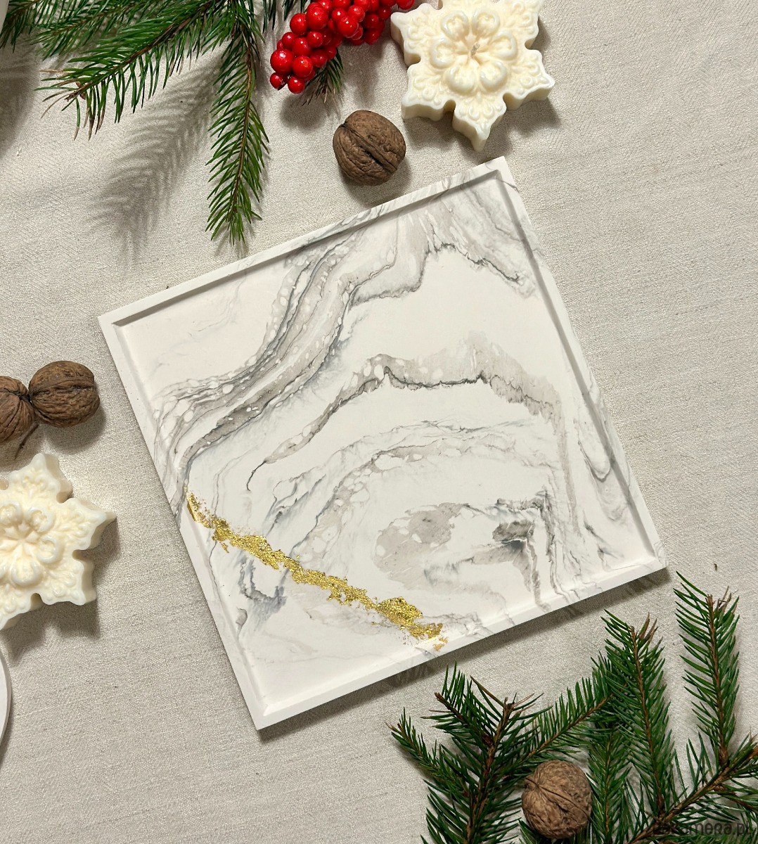Kwadratowa podstawka zachwyca unikatowym marmurkowym wzorem oraz subtelnym akcentem w postaci delikatnej linii z płatków złota 24kt, która dodaje jej elegancji i luksusowego charakteru. Jej twarda, gładka powierzchnia jest idealna pod dekoracje, świece, biżuterię czy kosmetyki. Każda podstawka jest jedyna w swoim rodzaju dzięki ręcznej technice wykonania.