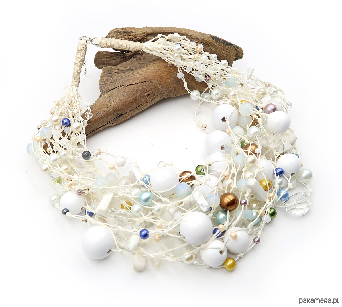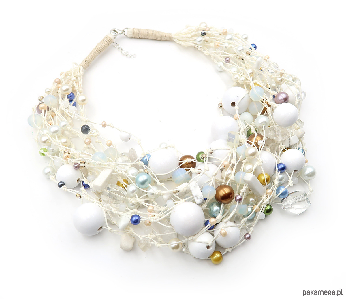 W splocie znajdują się szklane perełki, marmur, agaty, bryłki kwarcu, opalu, howlitu, drewno oraz szkło Jablonex. Naszyjnik długości ok. 48 cm, zapięcie posrebrzany karabińczyk.