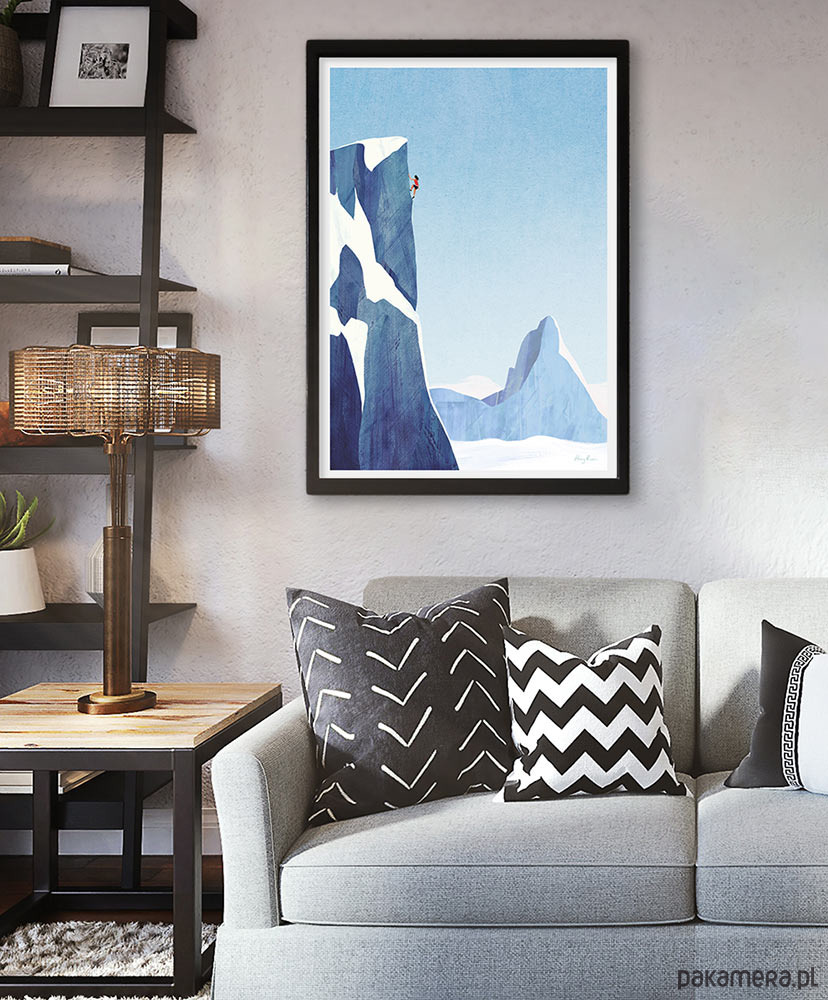 Majestatyczne góry w zimowej odsłonie i wspinająca się po stromej skale alpinistka. Ta zimowa grafika świetnie sprawdzi się w mieszkaniu każdego, kto kocha ekstremalne sporty górskie w ich najbardziej mroźnej wersji. Na plakacie błękitne tony nieba harmonizują z bielą śniegu i niebieskimi odcieniami ścian skalnych.
