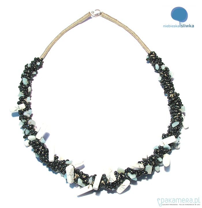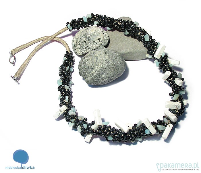 Wyjątkowy, inspirowany zimowym pejzażem naszyjnik wykonany w pojedynczym egzemplarzu. Powstał na bazie naturalnej przędzy lnianej z misternie wplecionych koralików szklanych Jablonex, nieregularnych bryłek amazonitu oraz pięknych pałeczek białego howlitu. Długość naszyjnika mierzona wewnątrz po zapięci ok. 65 cm, zapięcie ozdobne - posrebrzane. Biżuteria zawsze pakowana jest w firmowe płócienne woreczki oraz eko- kartonik. Gotowa na prezent! ------------- Wzór i projekt są strzeżone prawami autorskimi. Kopiowanie jest zabronione.