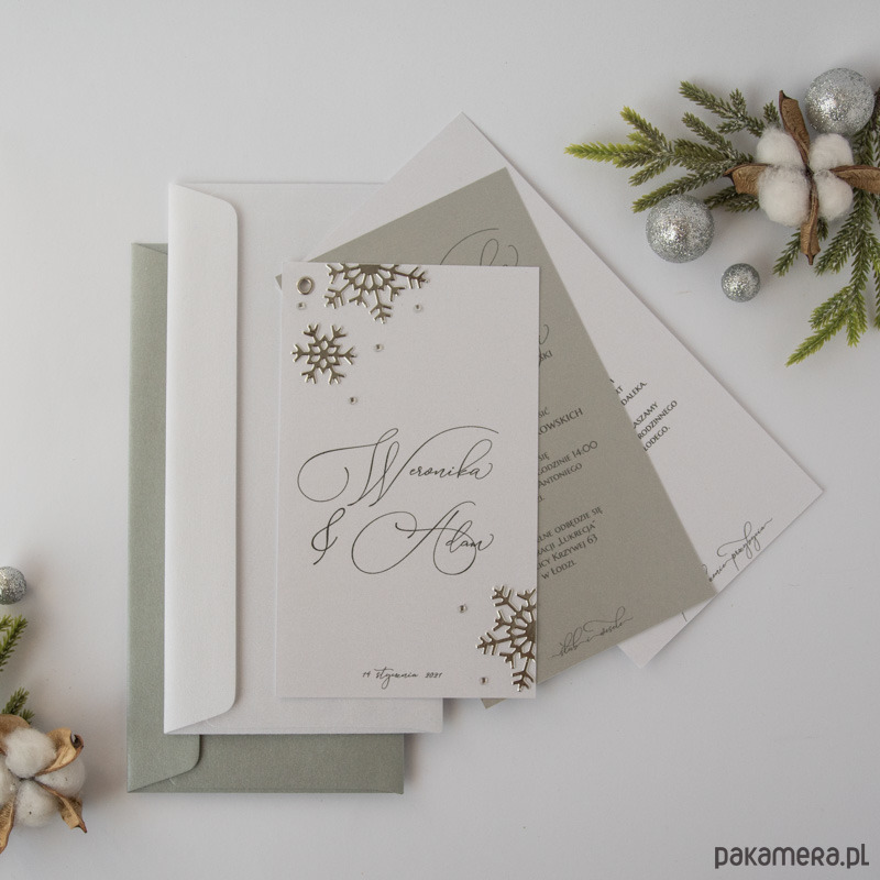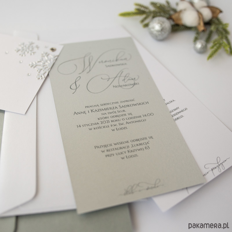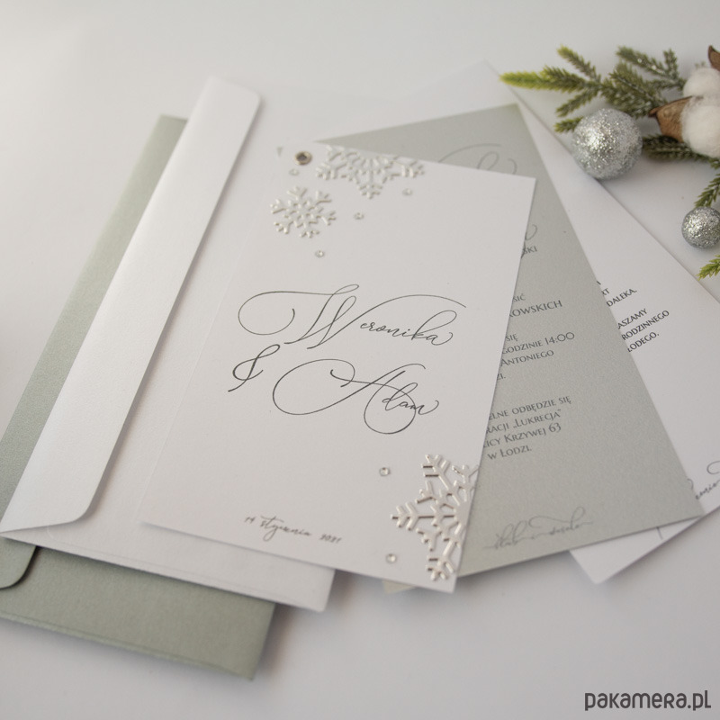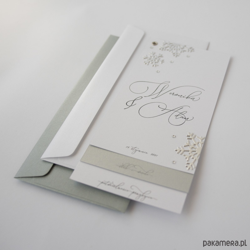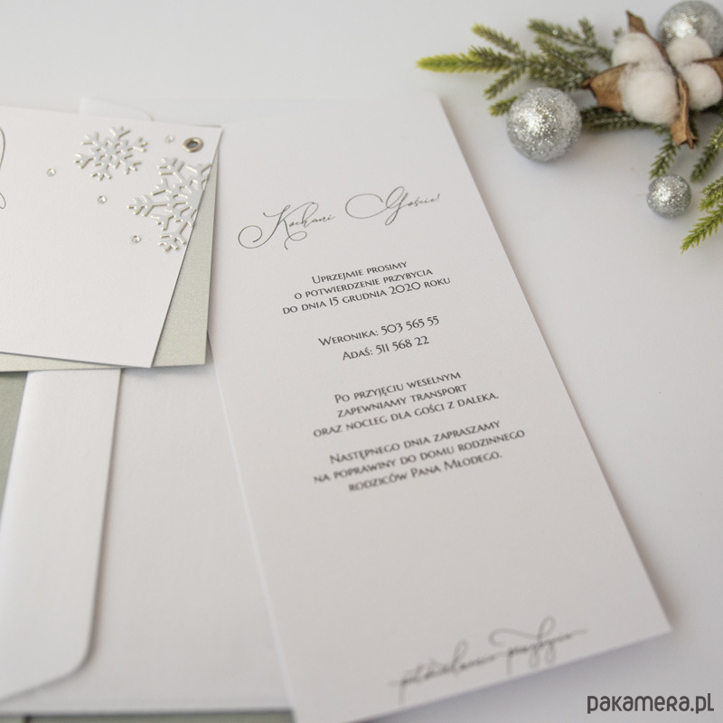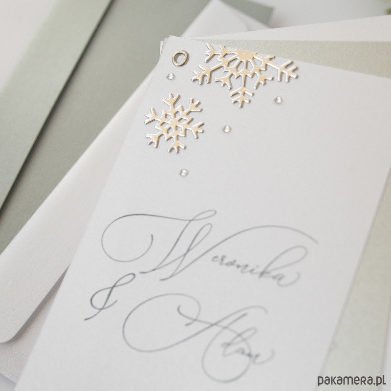 Model ten wyróżnia się minimalistyczną formą i przepięknym kaligraficznym fontem. Błyszczące srebrne śnieżynki nawiązują do zimowej scenerii wesela.
