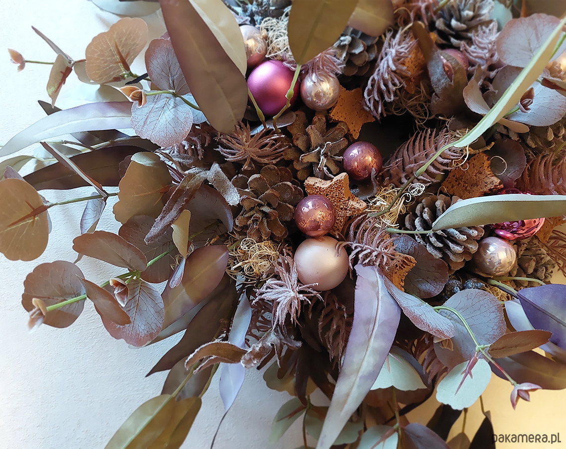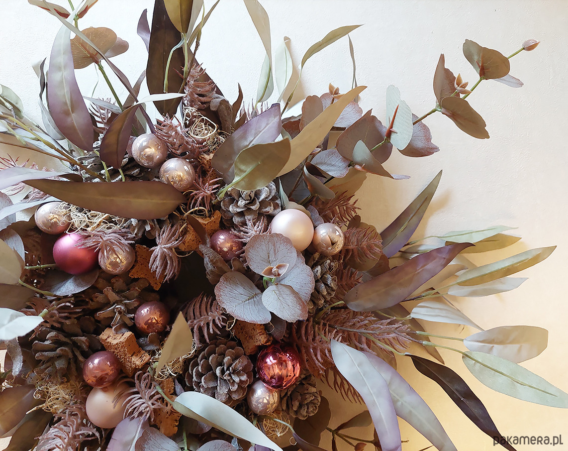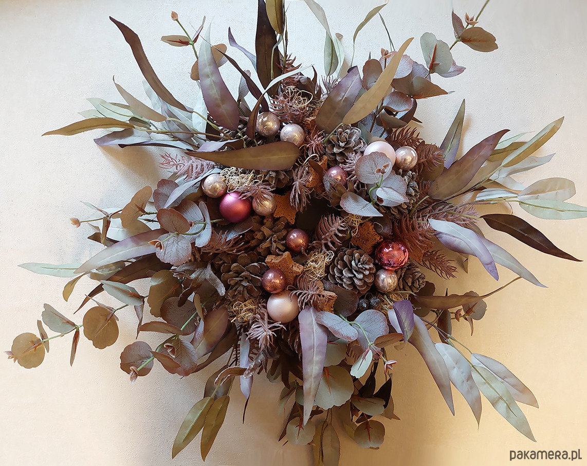Niebanalny, świąteczny wianek w oryginalnej kolorystyce. Wykonany z wysokiej jakości sztucznych gałązek eukaliptusa i perukowca. Udekorowany oszronionymi szyszkami, bombkami w stonowanych odcieniach różu i gwiazdkami z kory kokosa. Będzie trwałą ozdobą, która świetnie prezentuje się zarówno zawieszona jak i położona np. na stole. Starannie przechowany, będzie cieszył przez wiele świątecznych sezonów. Średnica ok. 55cm