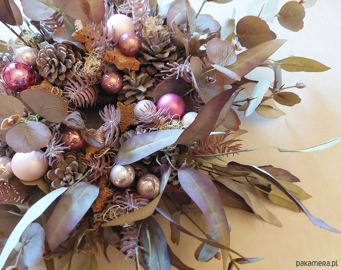 Niebanalny, świąteczny wianek w oryginalnej kolorystyce. Wykonany z wysokiej jakości sztucznych gałązek eukaliptusa i perukowca. Udekorowany oszronionymi szyszkami, bombkami w stonowanych odcieniach różu i gwiazdkami z kory kokosa. Będzie trwałą ozdobą, która świetnie prezentuje się zarówno zawieszona jak i położona np. na stole. Starannie przechowany, będzie cieszył przez wiele świątecznych sezonów. Średnica ok. 55cm