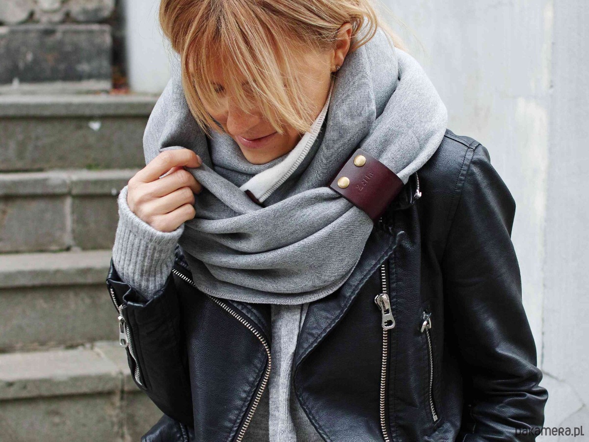Ciepły komin dresowy damski – SZARY z zapinką skórzaną