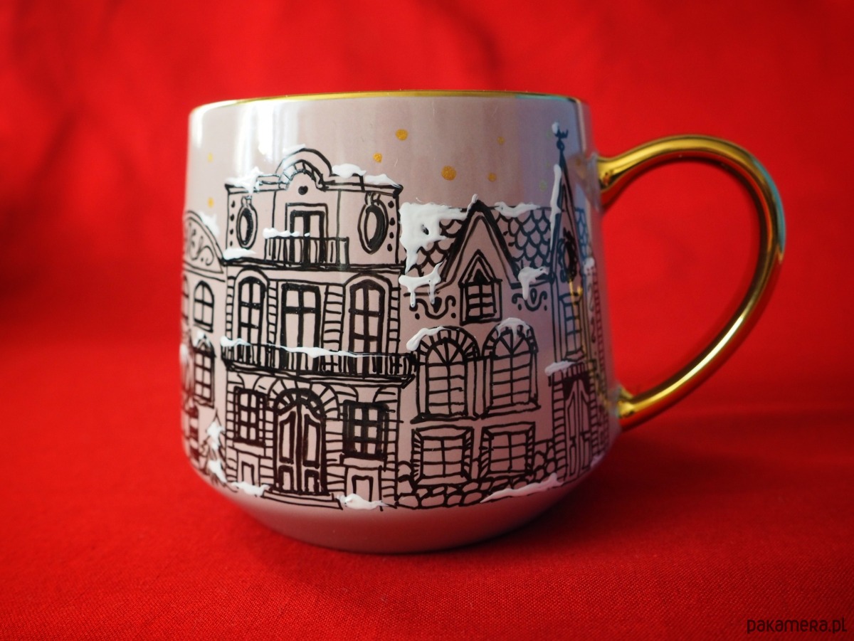 Wzór zimowych kamieniczek wykonany został przy użyciu nietoksycznych farb do porcelany, jest wodoodporny - naczynie może być myte ręcznie, bez użycia ostrych narzędzi.