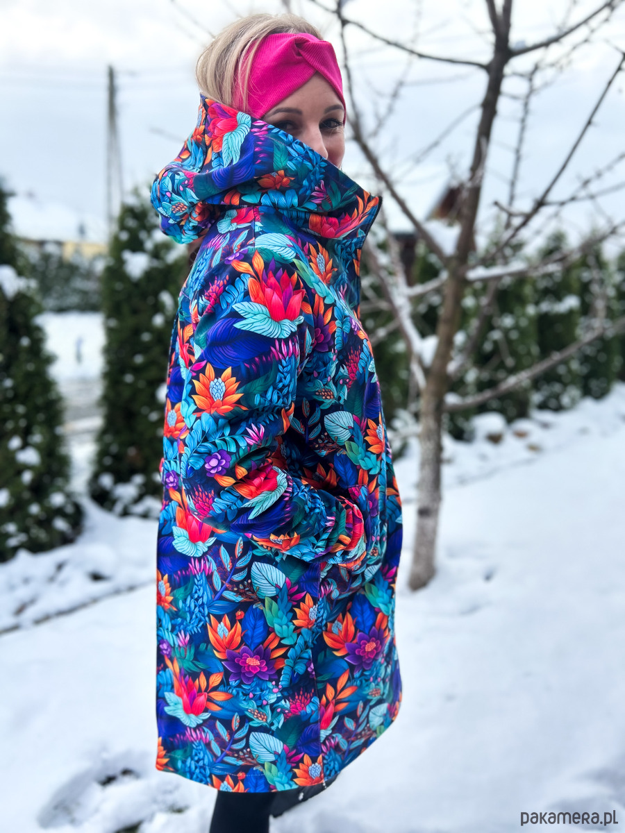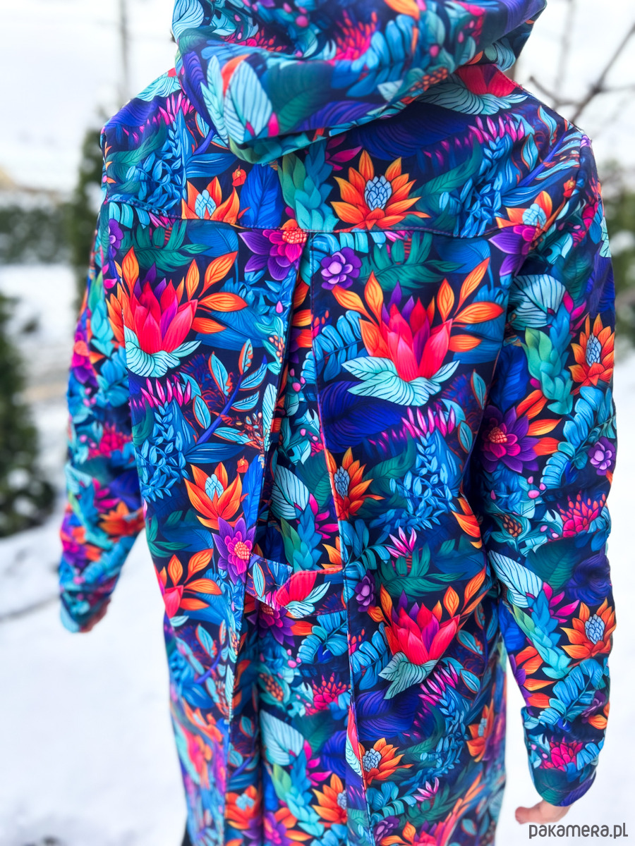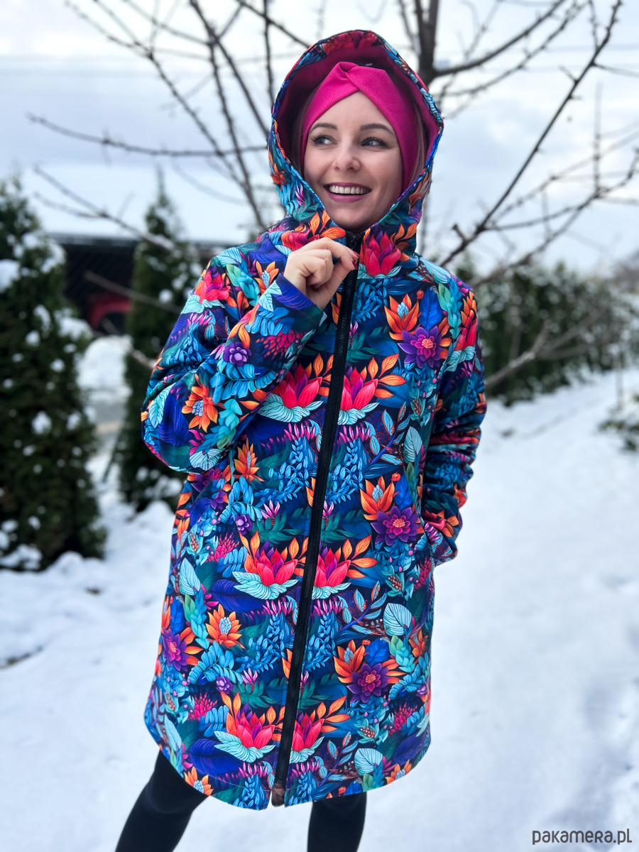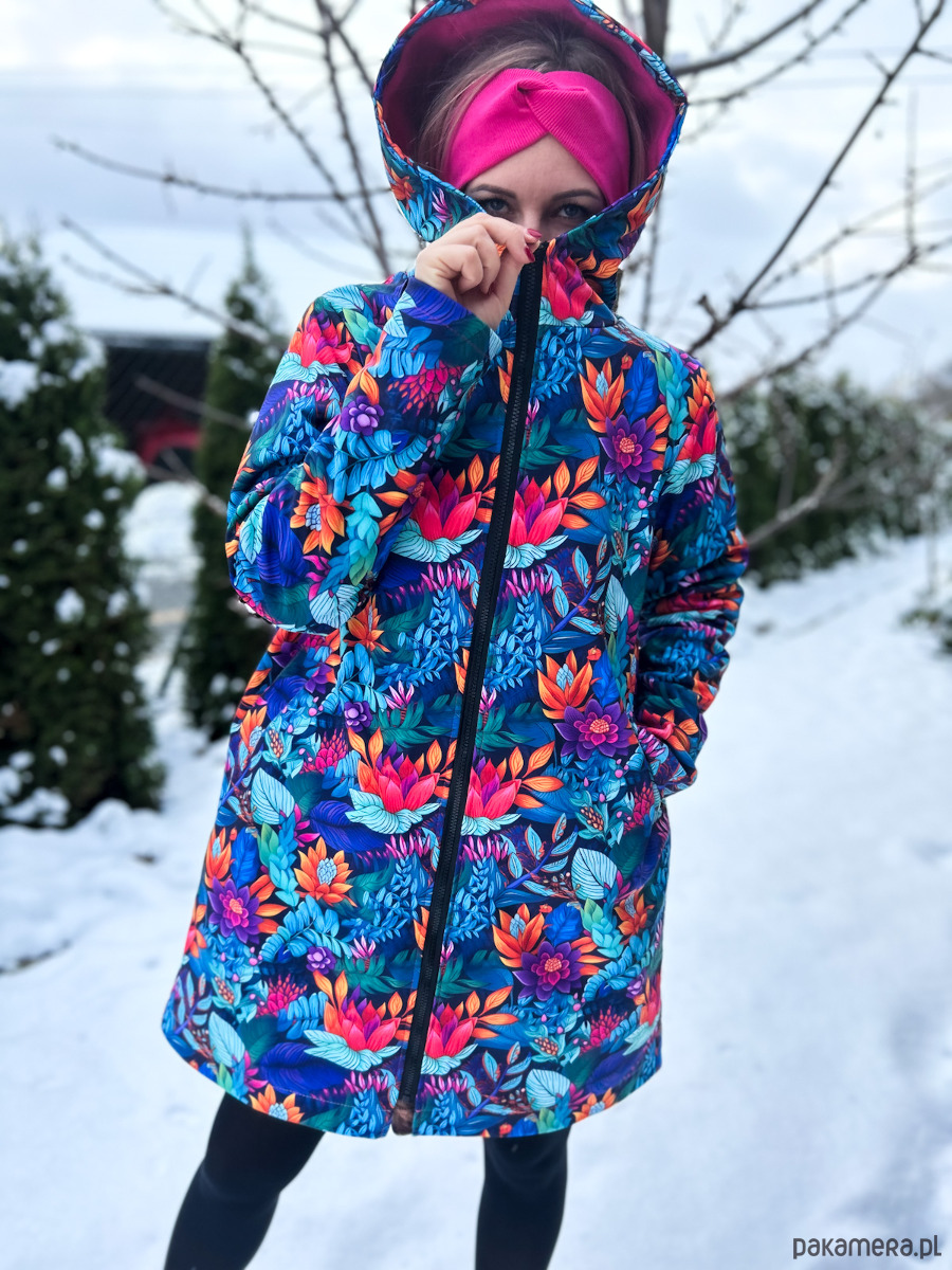 Zimowa kurtka damska typu płaszczyk, ocieplana. Wyróżnij się zimą! Czas na wzorzysty płaszczyk! tu wzór: tropikalny ogród