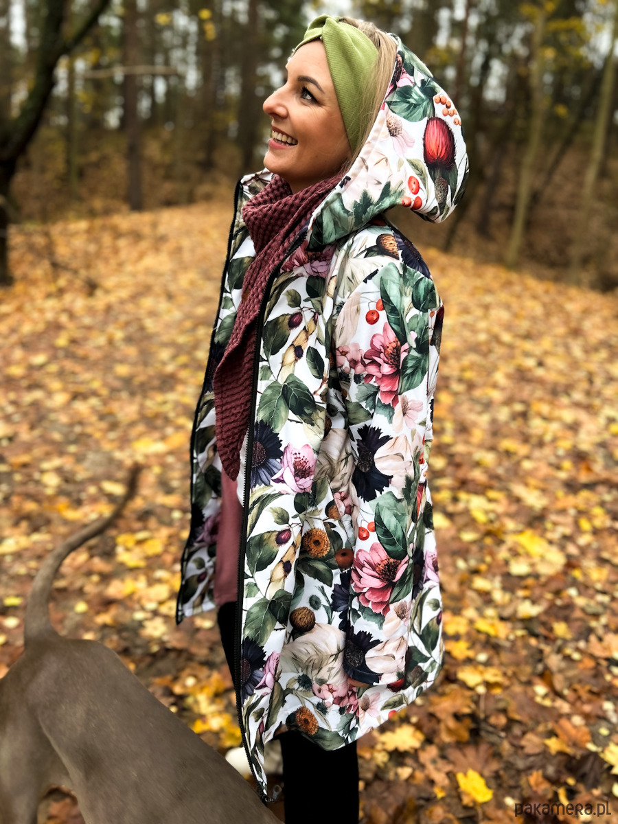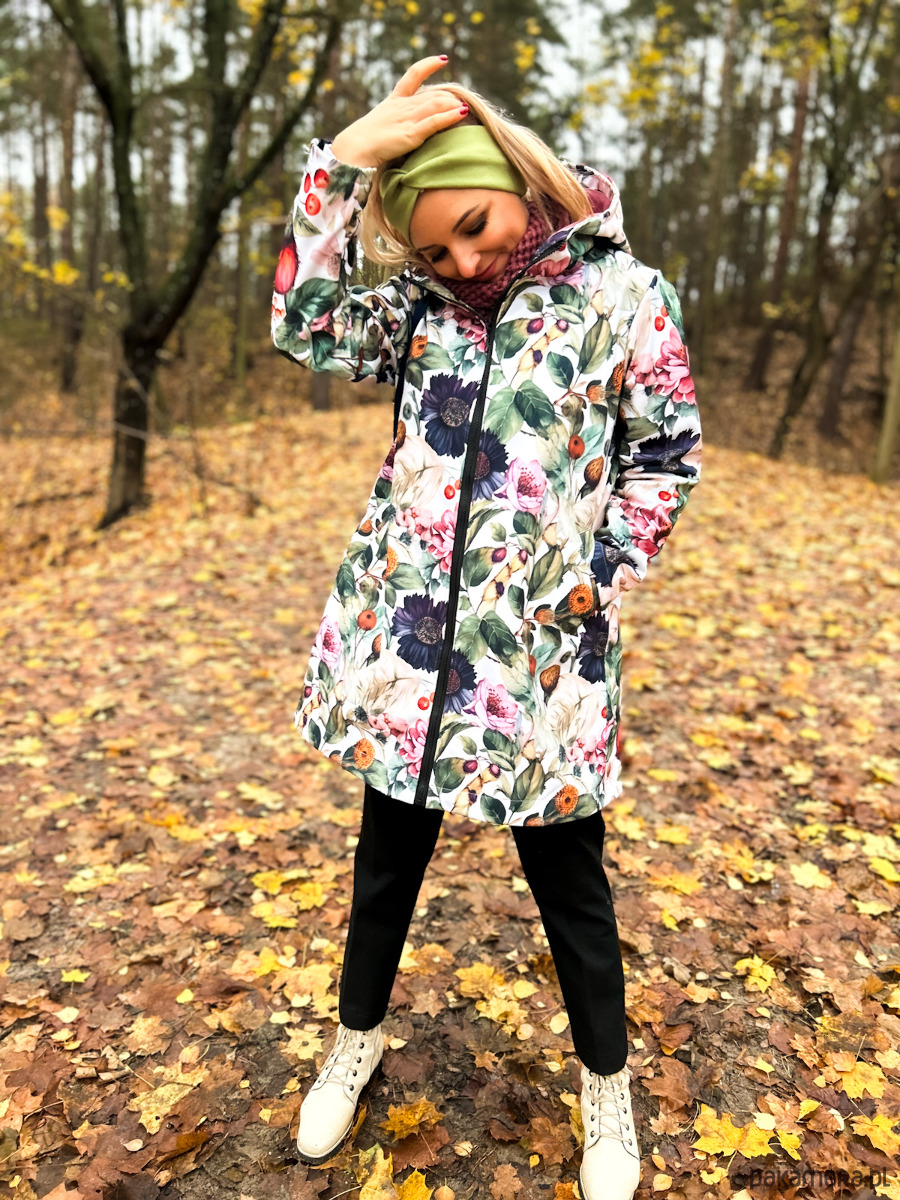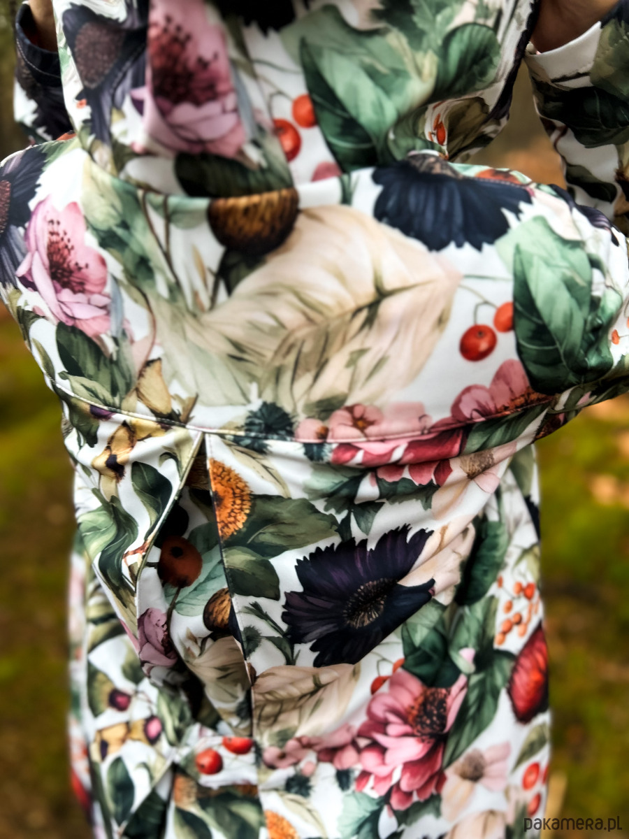 Zimowa kurtka damska typu płaszczyk, ocieplana. Wyróżnij się zimą! Czas na wzorzysty płaszczyk kwiaty vintage!
