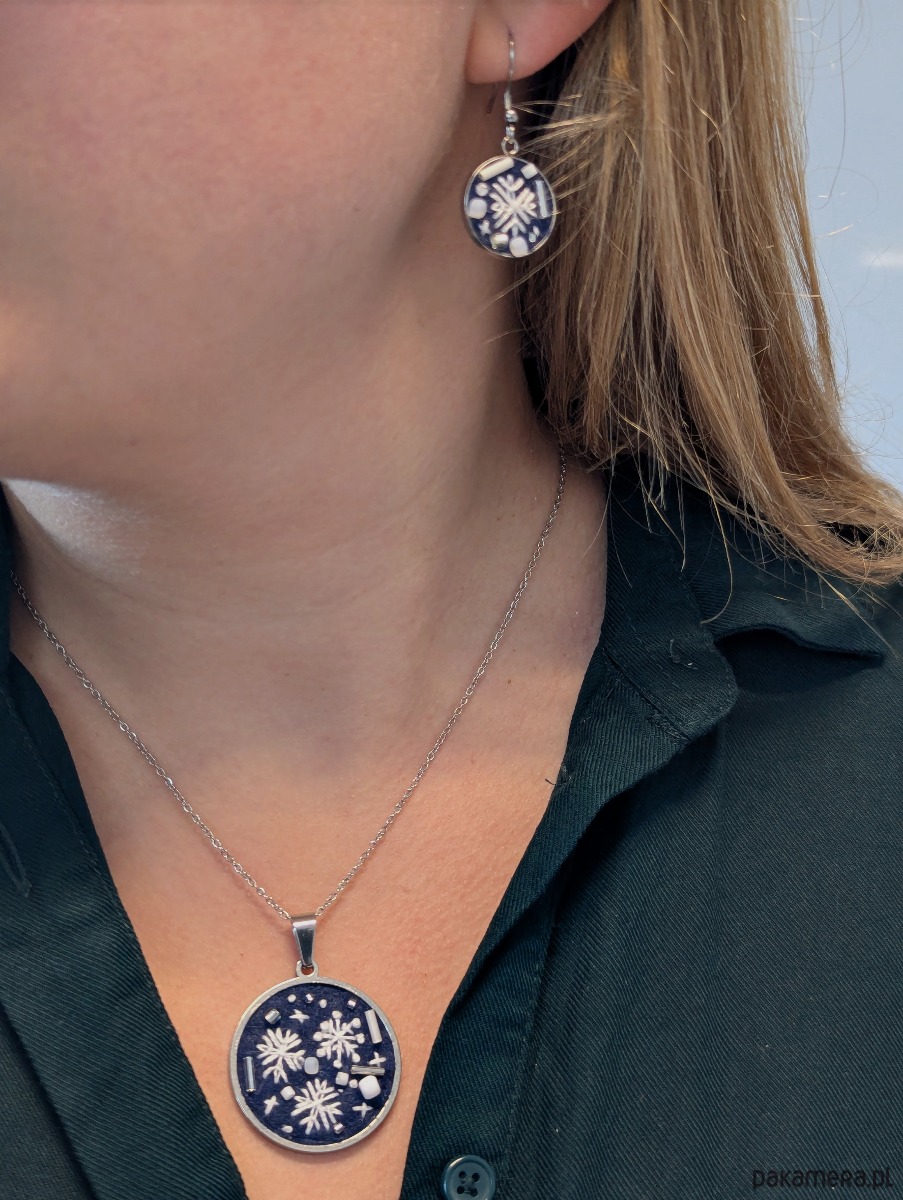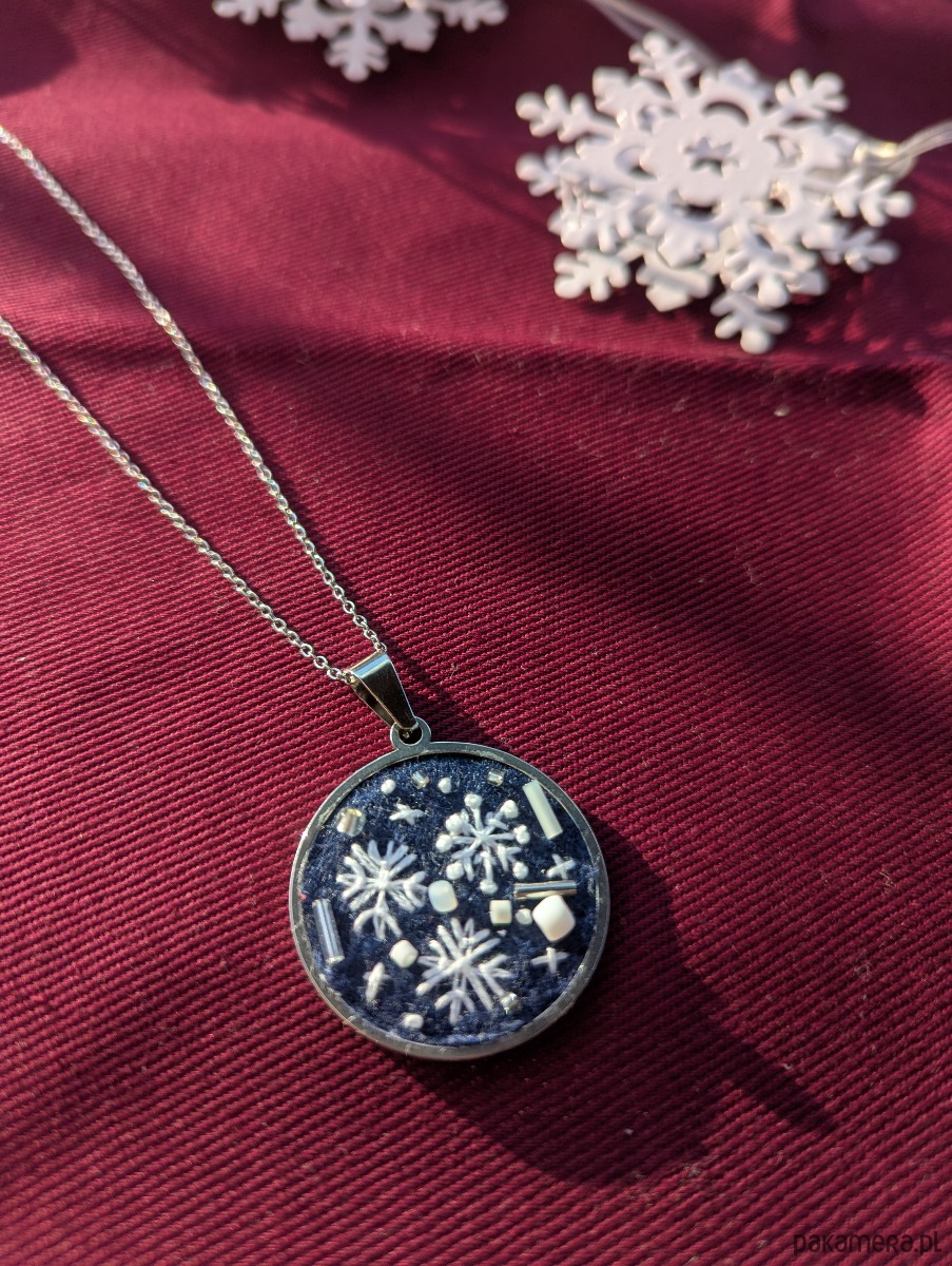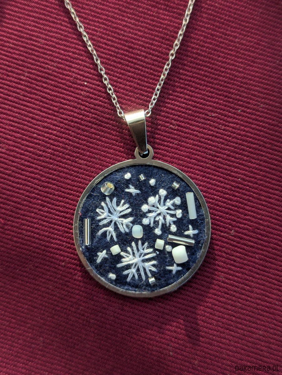 Ten ręcznie haftowany naszyjnik powstał z myślą o zimie i świątecznym klimacie. Na granatowym filcu wyhaftowałam białe śnieżynki, filc ozdobiłam też połyskującymi koralikami. Dzięki temu każdy ruch wydobywa subtelny blask, przywodzący na myśl migoczące światła i skrzący się śnieg.