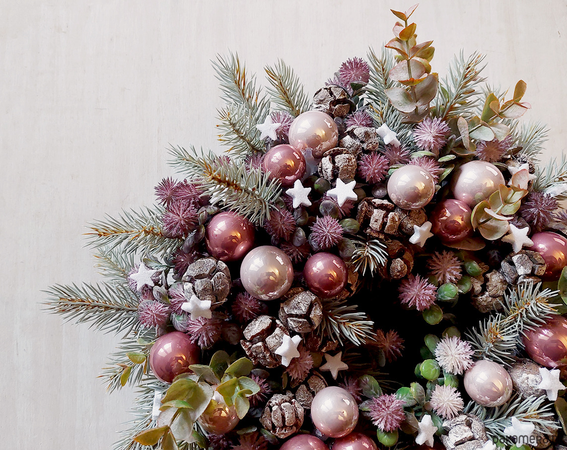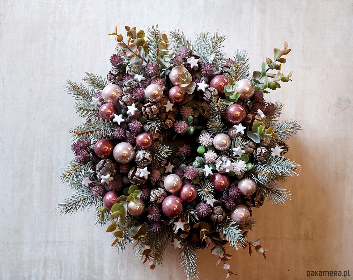 Niebanalny, świąteczny wianek w oryginalnej kolorystyce. Wykonany z wysokiej jakości sztucznych gałązek srebrnego świerku, drobnych gałazek z owocami i eukaliptusa. Udekorowany suszonymi owocami cyprysu, bombkami w stonowanych odcieniach różu i połyskującymi drobnymi gwiazdkami. Będzie trwałą ozdobą, która świetnie prezentuje się zarówno zawieszona jak i położona np. na stole. Starannie przechowany, będzie cieszył przez wiele świątecznych sezonów. Średnica ok. 35cm