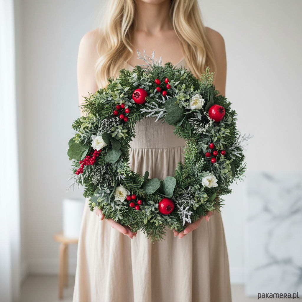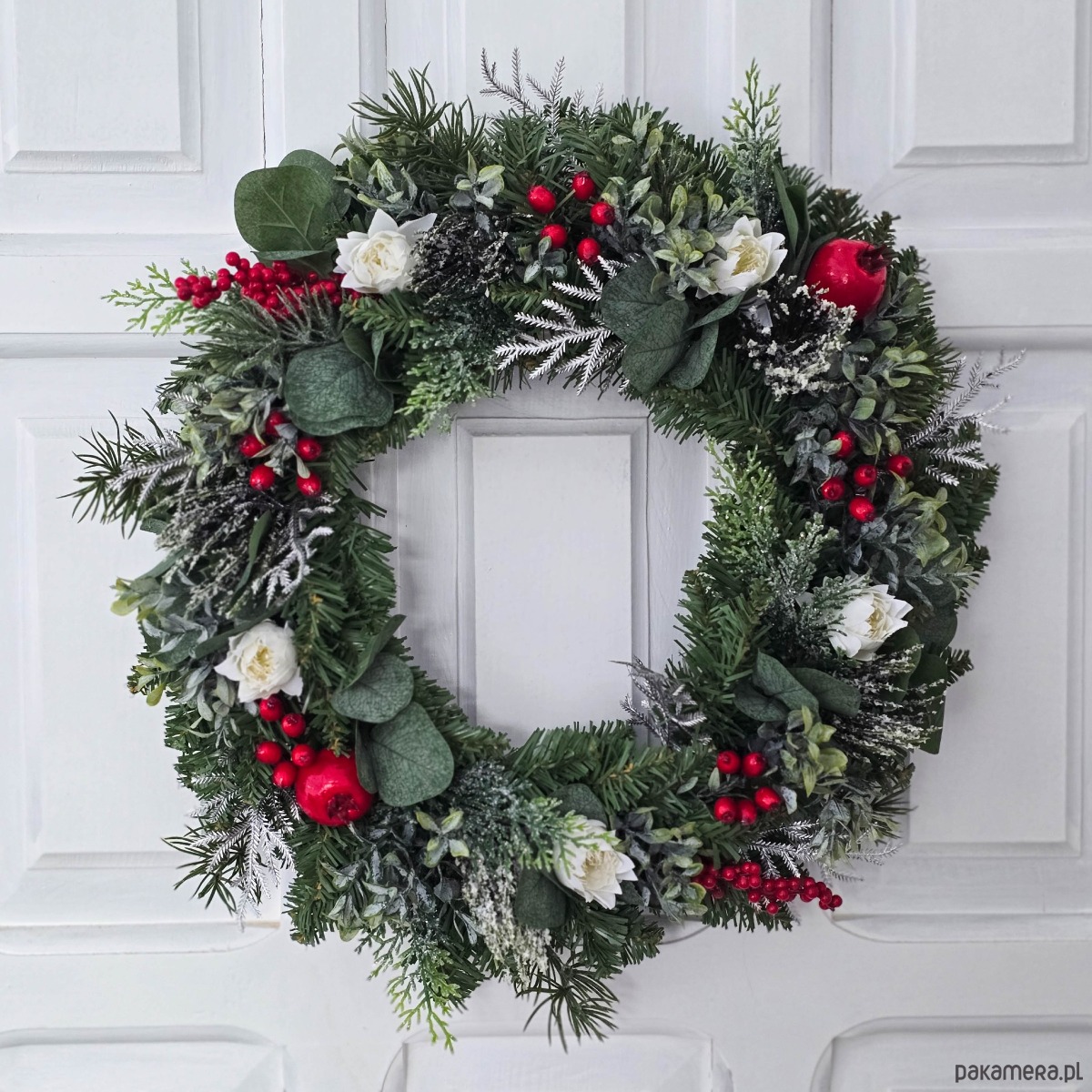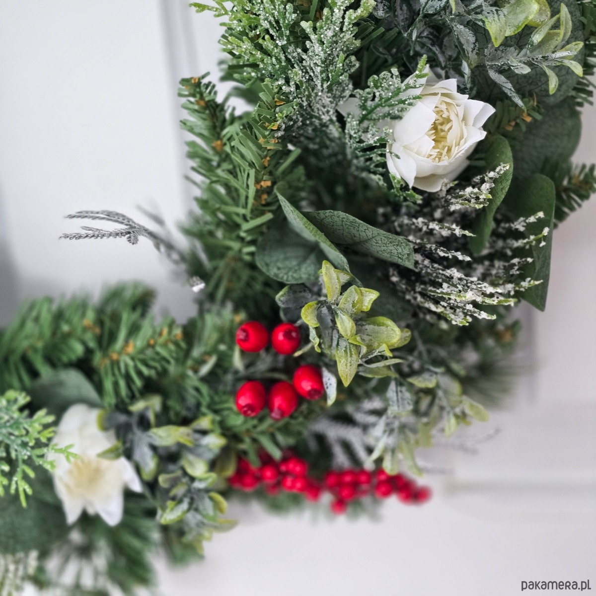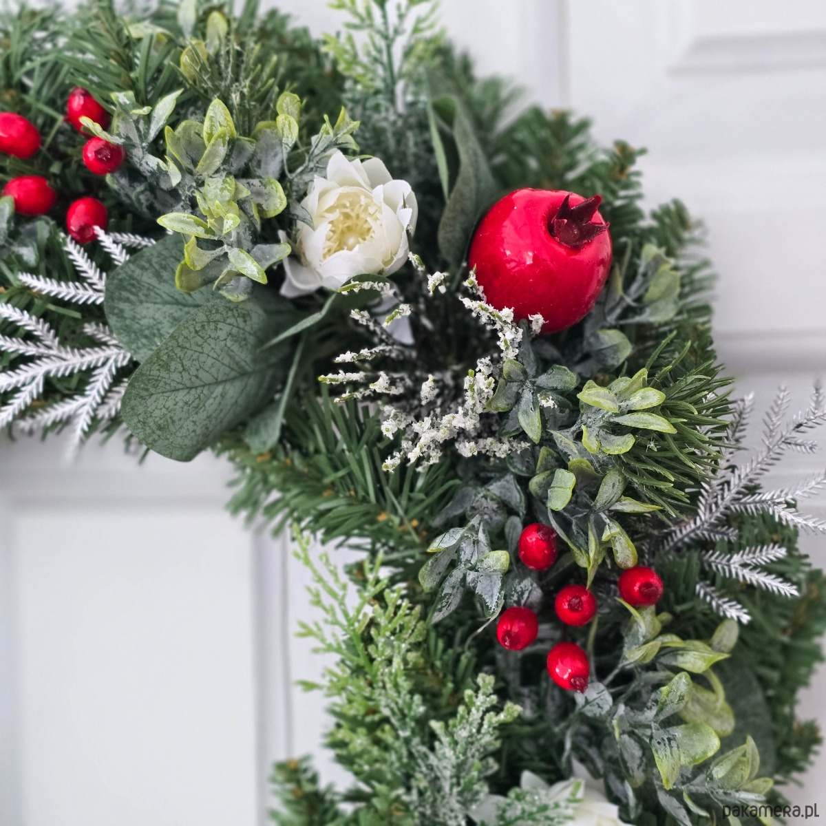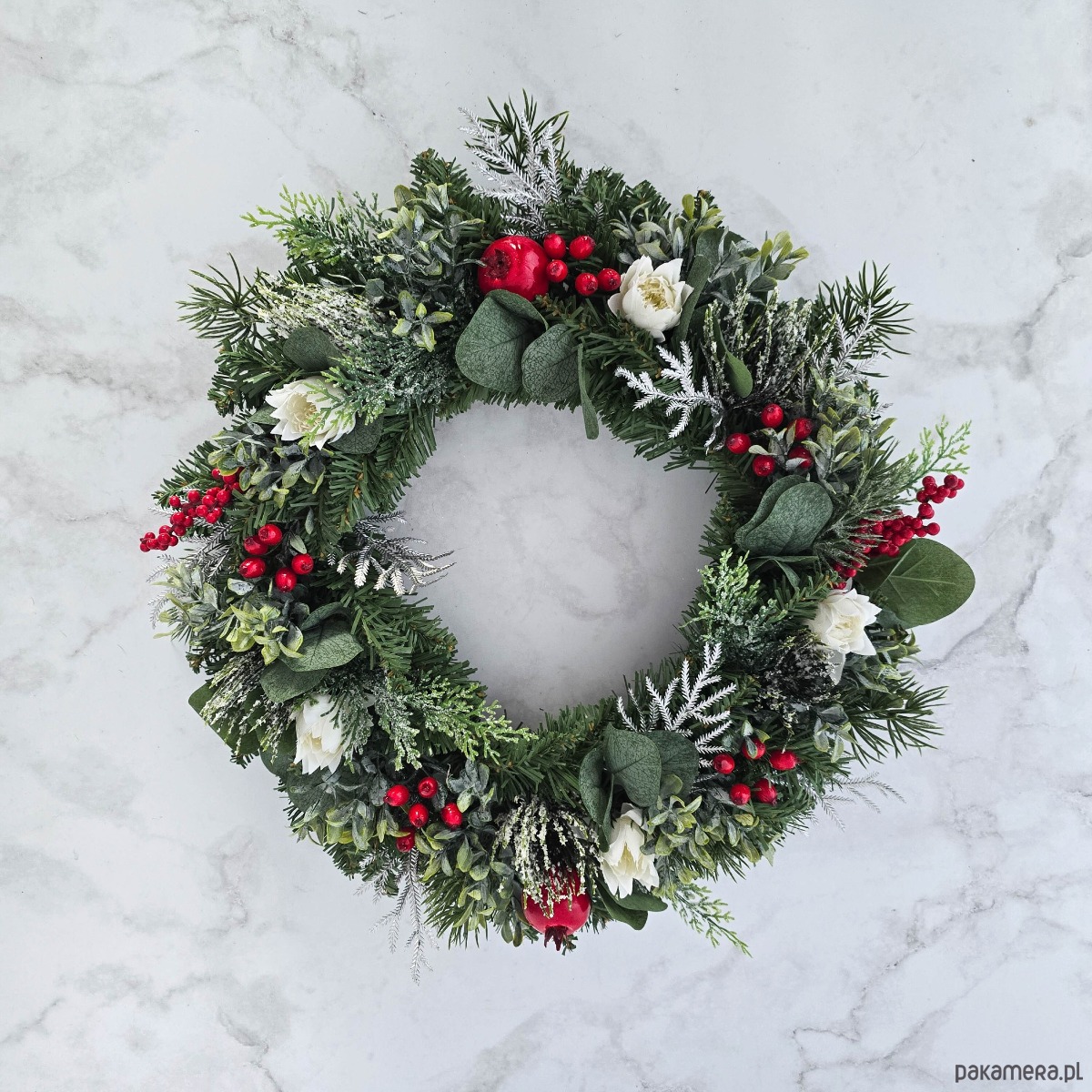 Piękny, zimowy wianek na drzwi, ścianę lub stół. Wykonany z wysokiej jakości syntetycznych gałązek oraz dodatków, więc przetrwa w doskonałym stanie kilka sezonów . Wianek wypleciony ręcznie, z najwyższą starannością, w pracowni "Lola White" w Polsce.