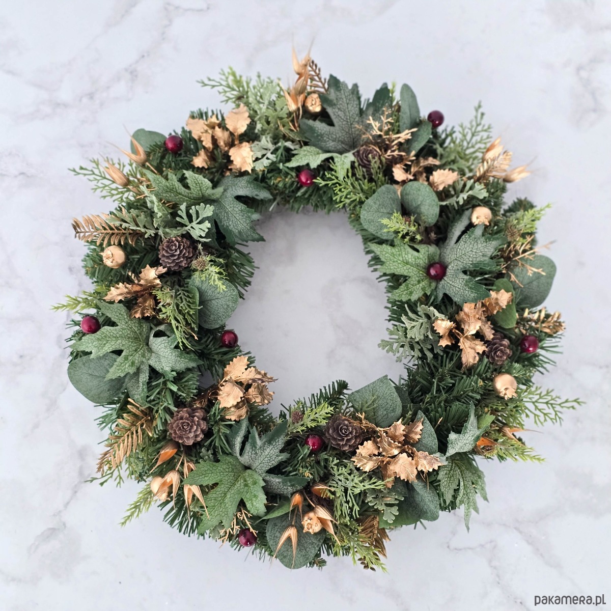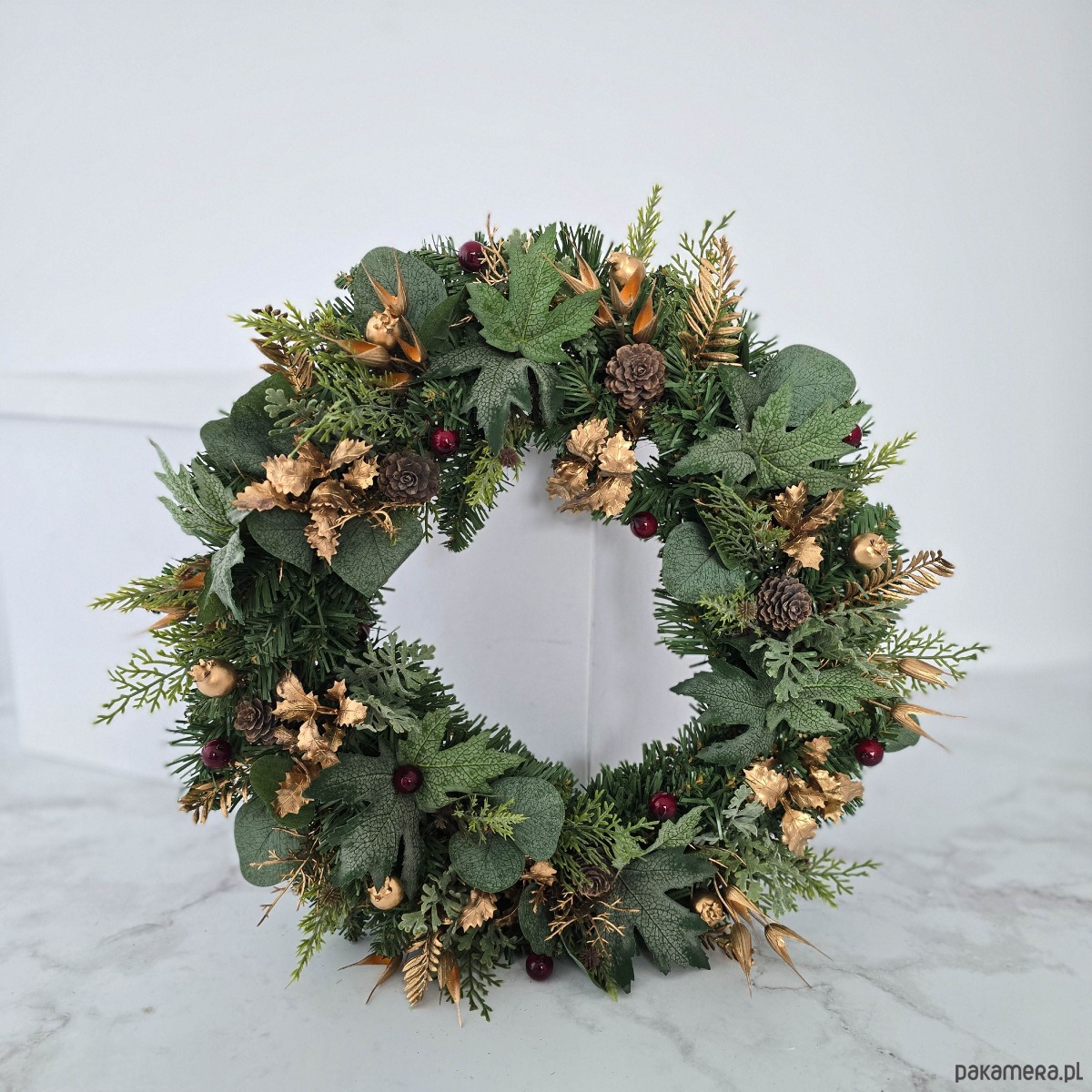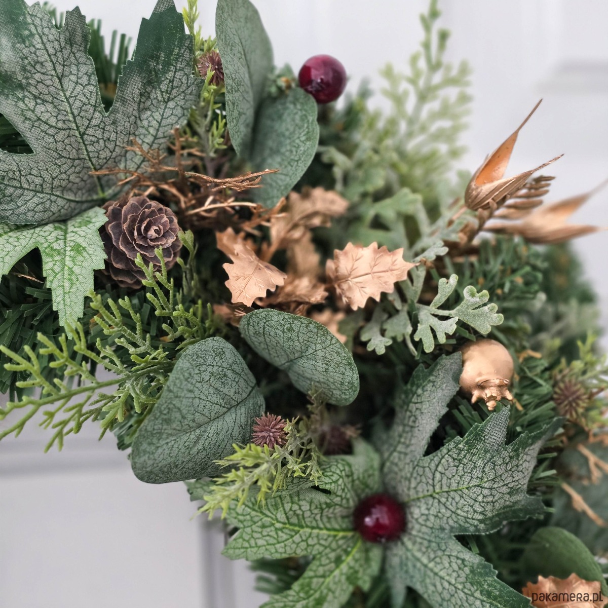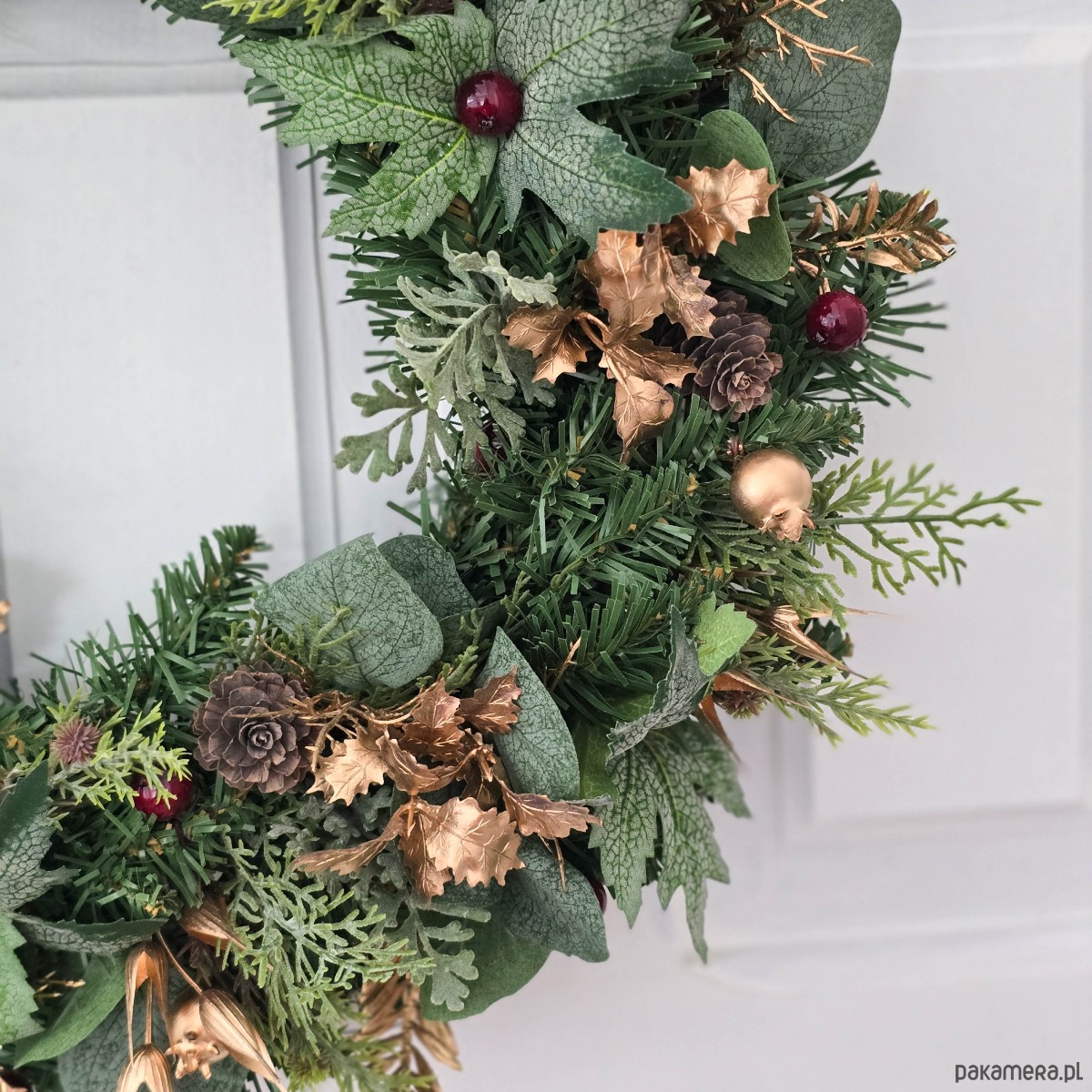 Piękny, zimowy wianek na drzwi, ścianę lub stół. Wykonany z wysokiej jakości syntetycznych gałązek oraz dodatków, więc przetrwa w doskonałym stanie kilka sezonów . Wianek wypleciony ręcznie, z najwyższą starannością, w pracowni "Lola White" w Polsce.