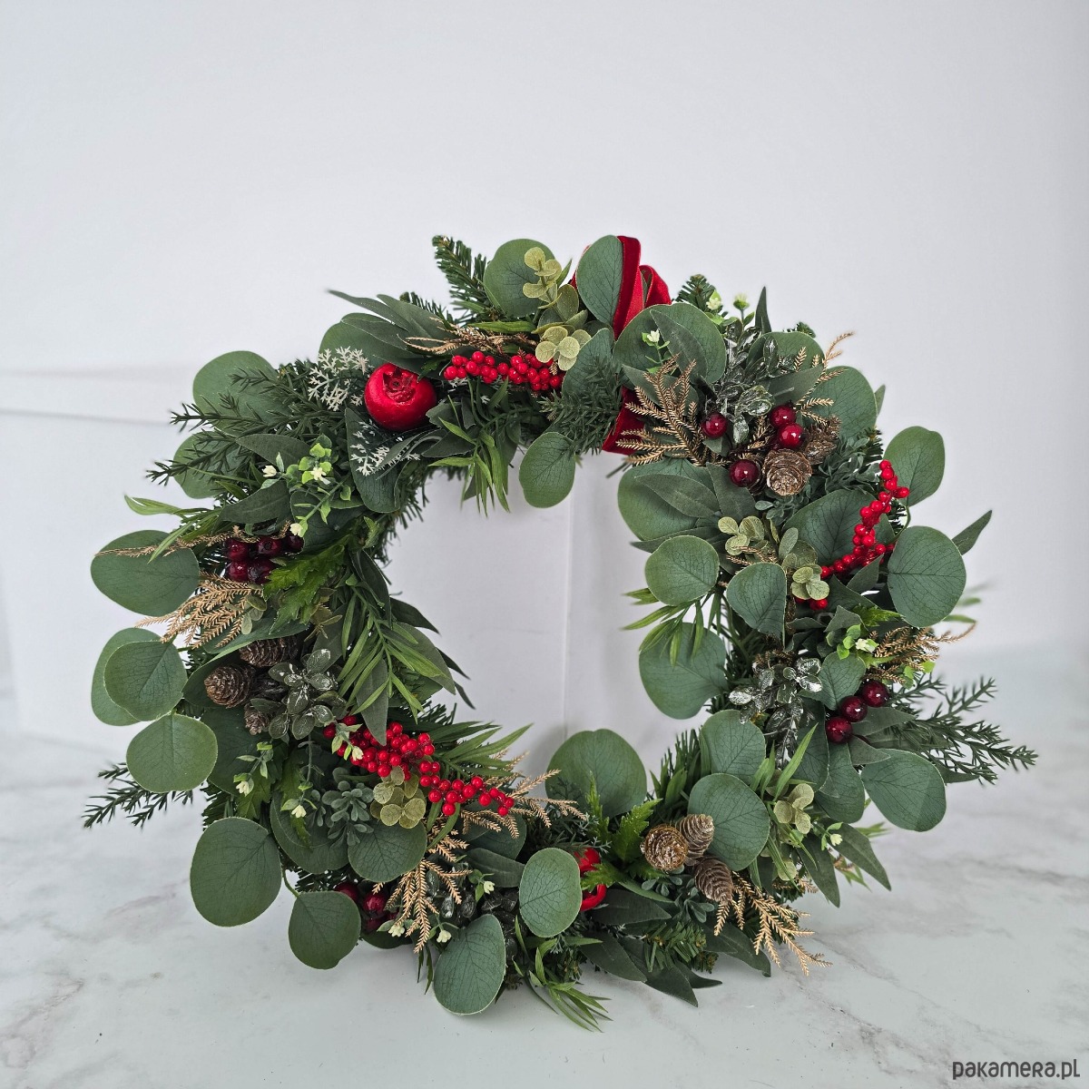 Piękny, zimowy wianek na drzwi, ścianę lub stół. Wykonany z wysokiej jakości syntetycznych gałązek oraz dodatków, więc przetrwa w doskonałym stanie kilka sezonów . Wianek wypleciony ręcznie, z najwyższą starannością, w pracowni "Lola White" w Polsce.