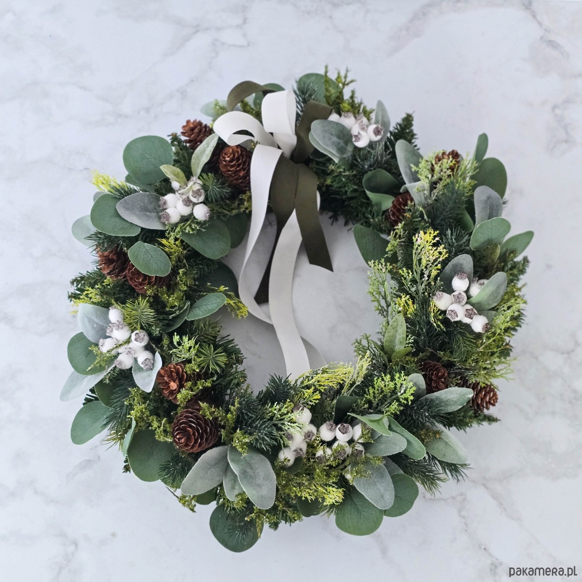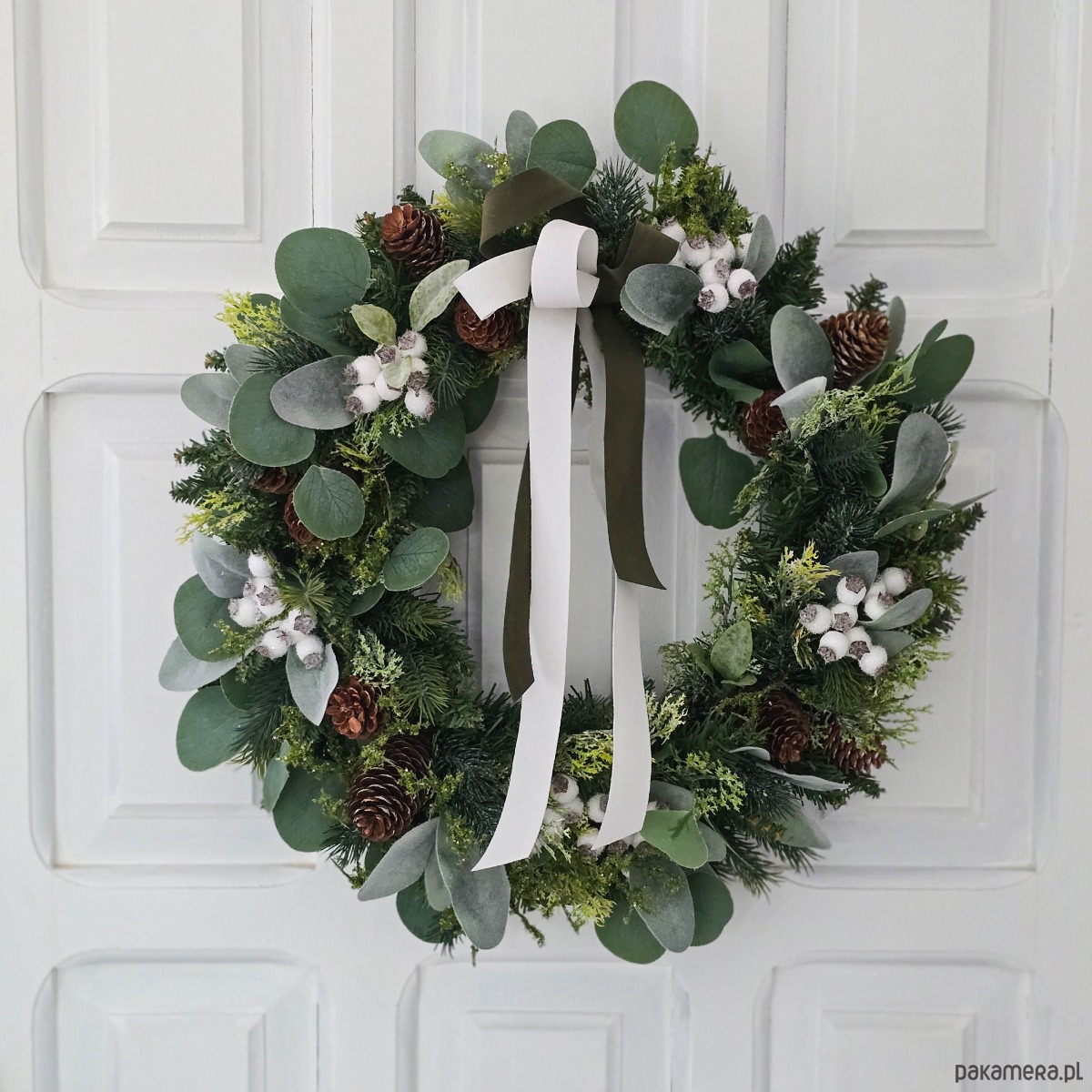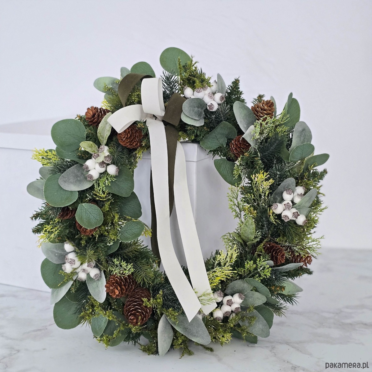 Piękny, zimowy wianek na drzwi, ścianę lub stół. Wykonany z wysokiej jakości syntetycznych gałązek oraz dodatków, więc przetrwa w doskonałym stanie kilka sezonów . Wianek wypleciony ręcznie, z najwyższą starannością, w pracowni "Lola White" w Polsce.