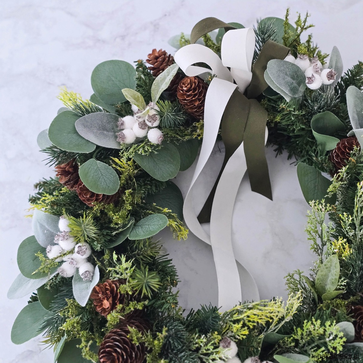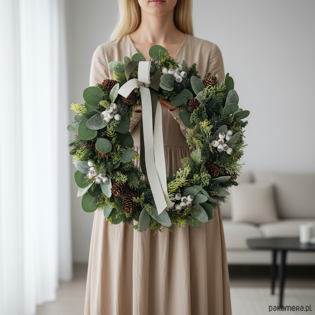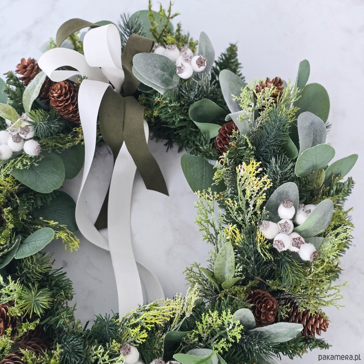 Piękny, zimowy wianek na drzwi, ścianę lub stół. Wykonany z wysokiej jakości syntetycznych gałązek oraz dodatków, więc przetrwa w doskonałym stanie kilka sezonów . Wianek wypleciony ręcznie, z najwyższą starannością, w pracowni "Lola White" w Polsce.
