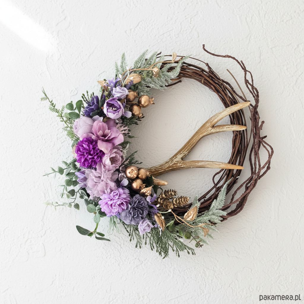 Zimowy wieniec - fioletowe kwiaty i róg (26cm)