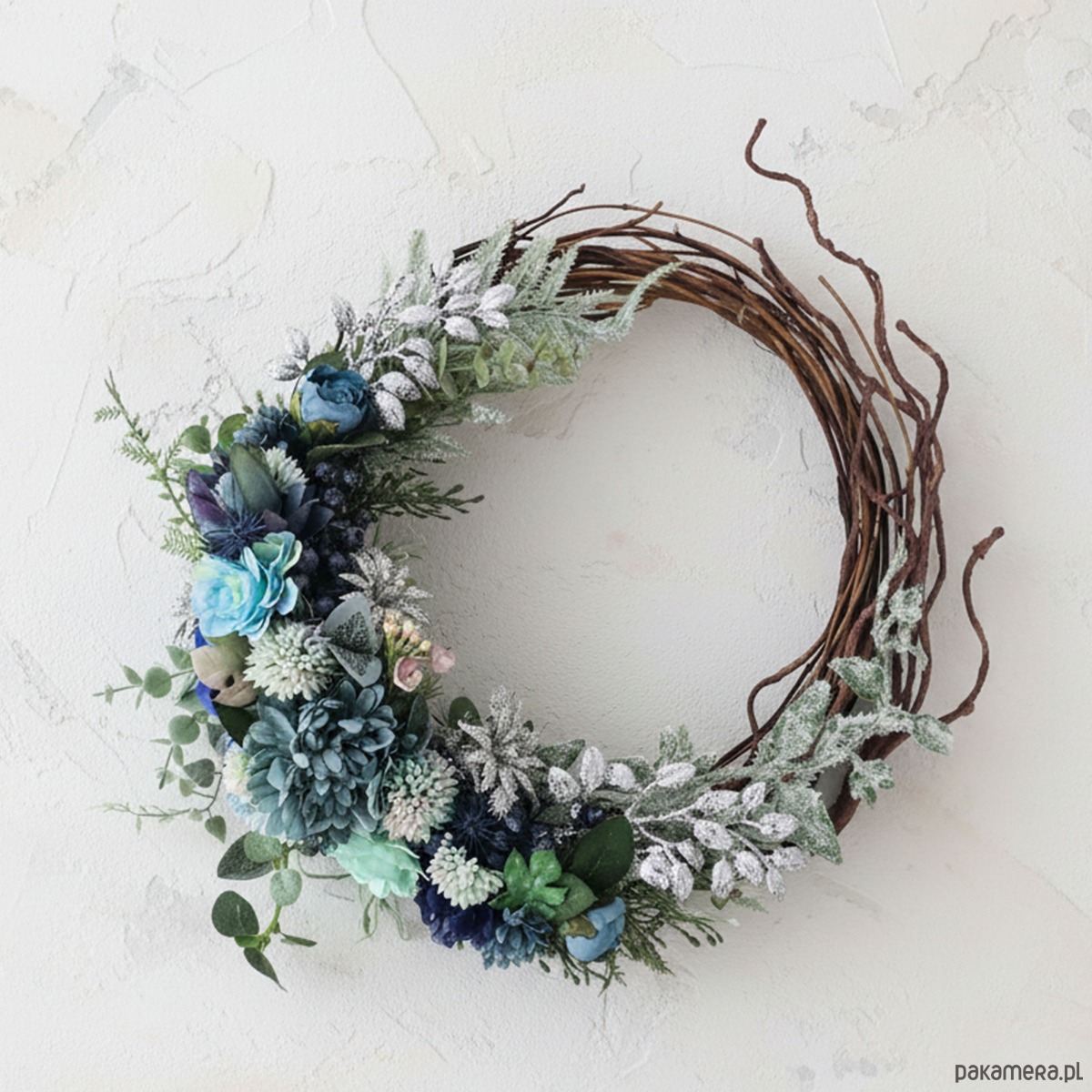 Piękny, asymetryczny wianek na drzwi, ścianę lub stół. Wykonany z wysokiej jakości syntetycznych gałązek oraz dodatków, więc przetrwa w doskonałym stanie kilka sezonów . Wianek wypleciony ręcznie, z najwyższą starannością, w pracowni "Lola White" w Polsce.