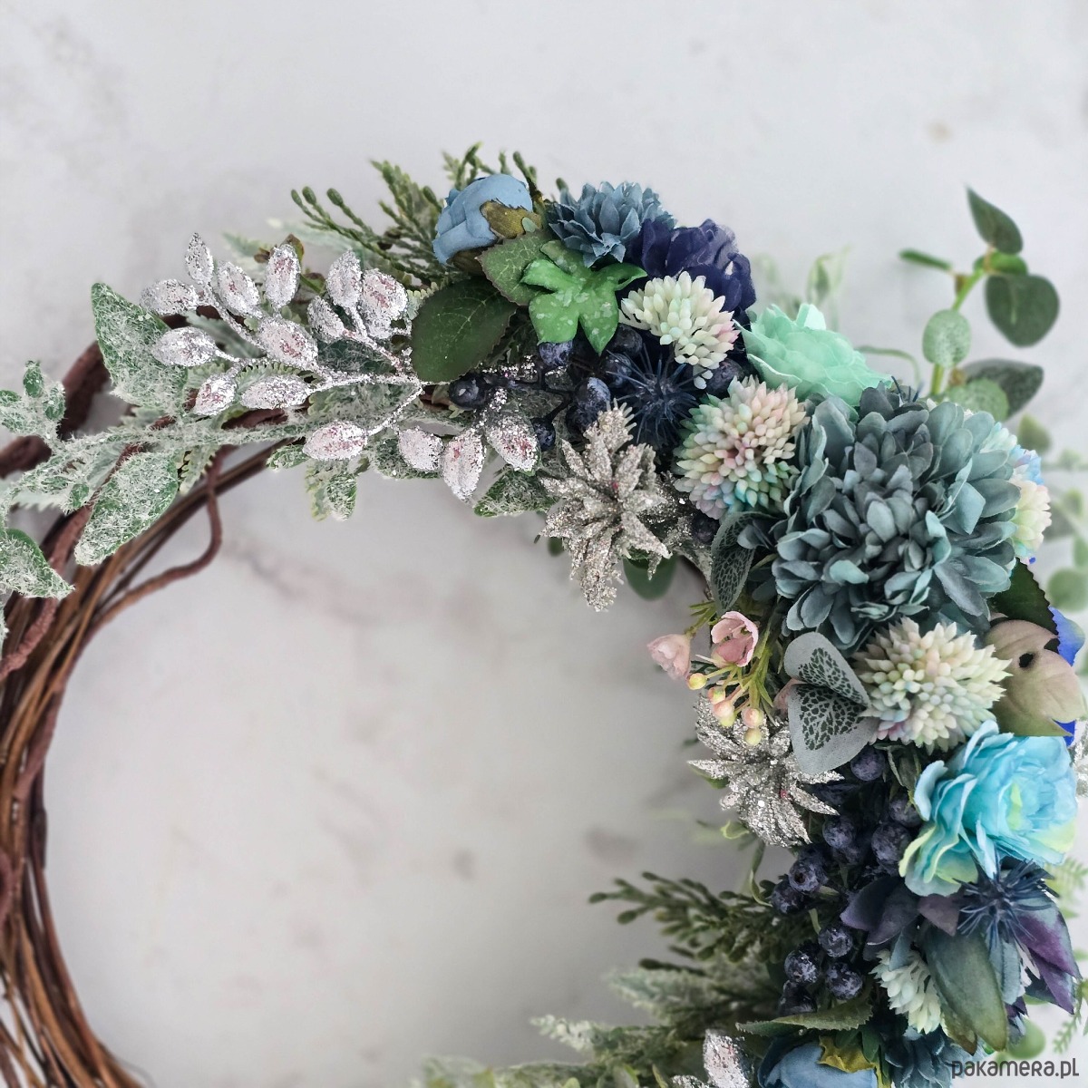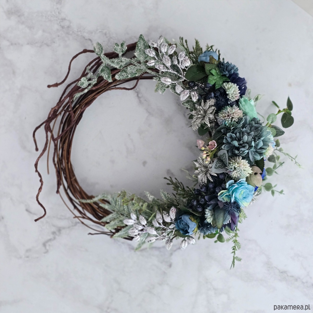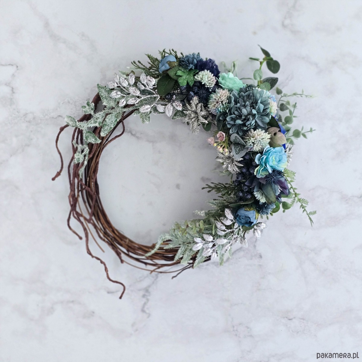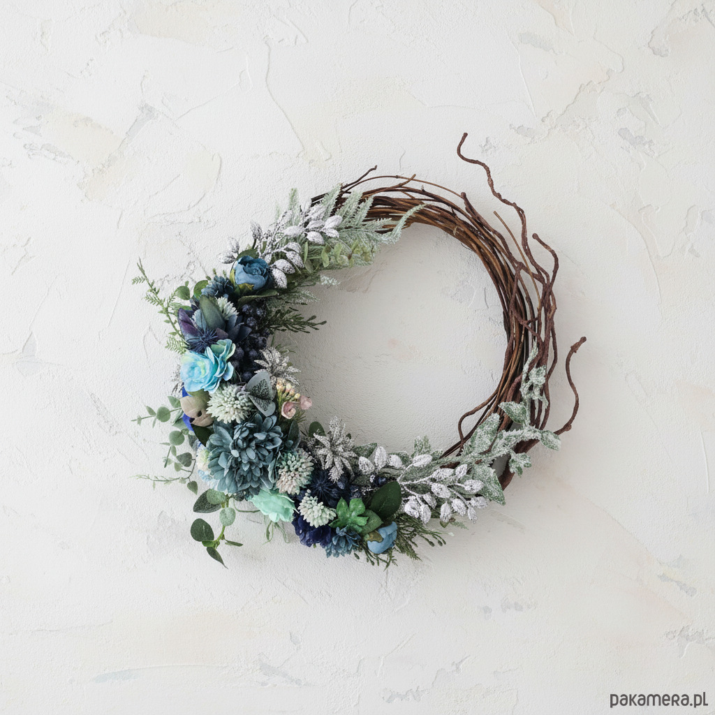 Zimowy wieniec - odcienie błękitu i srebro (26cm)