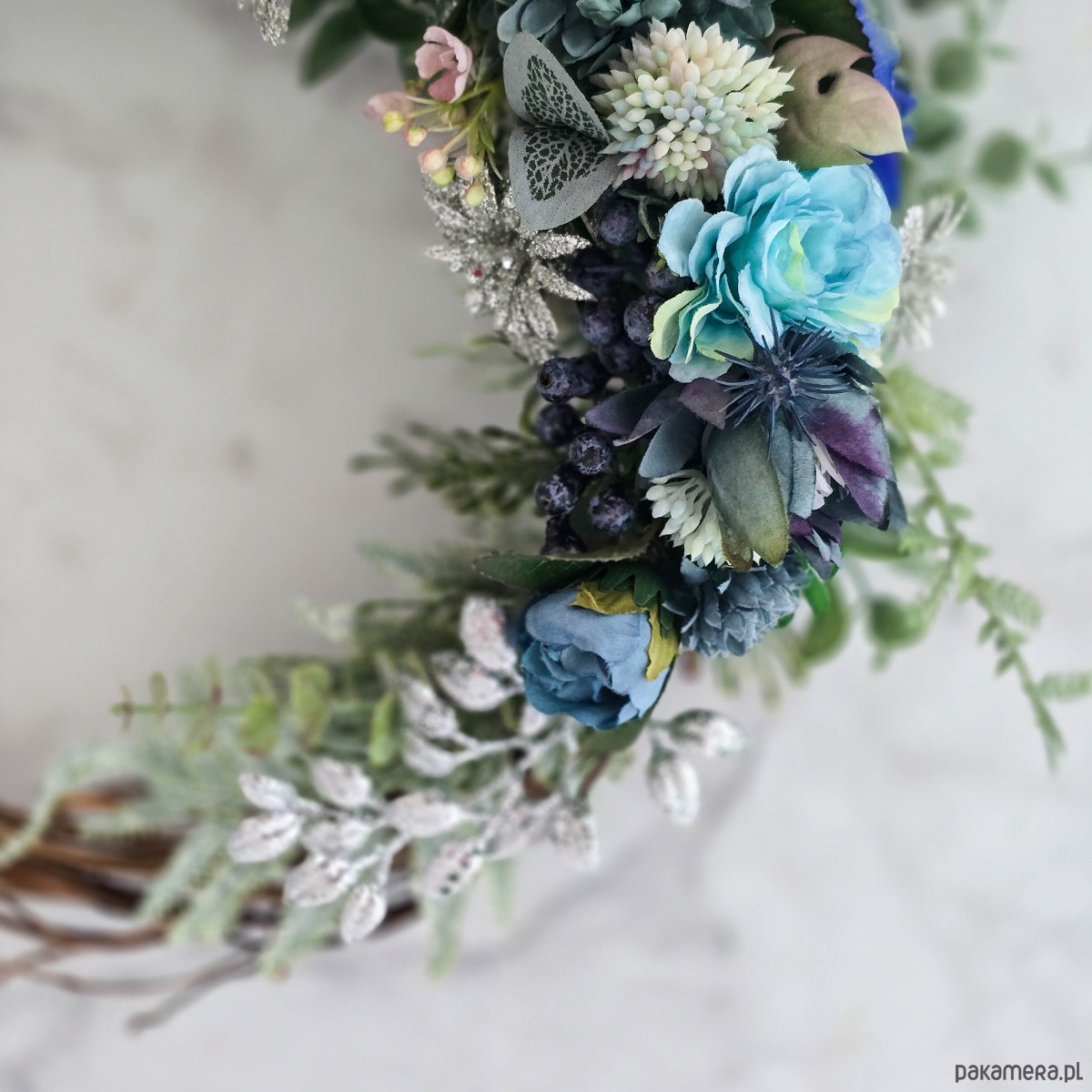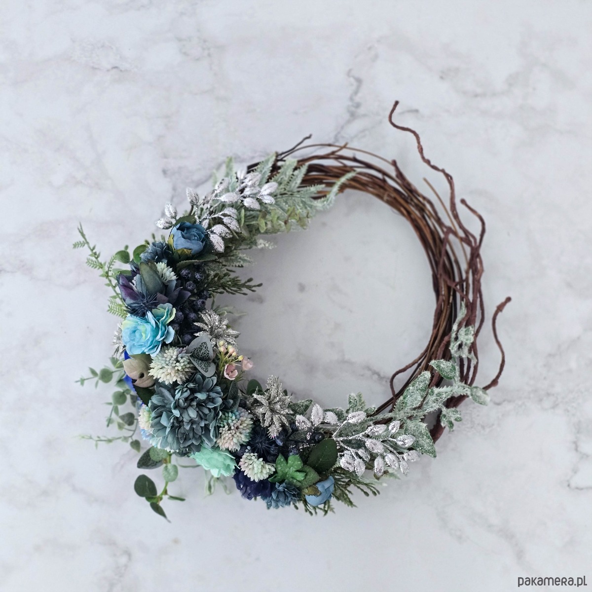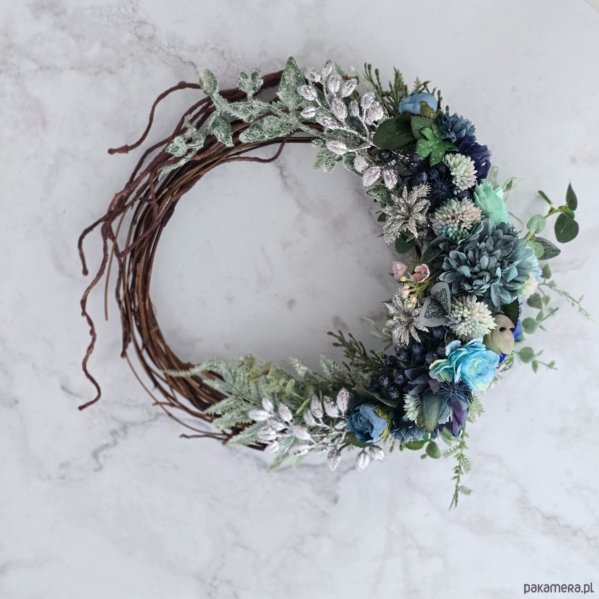 Zimowy wieniec - odcienie błękitu i srebro (26cm)