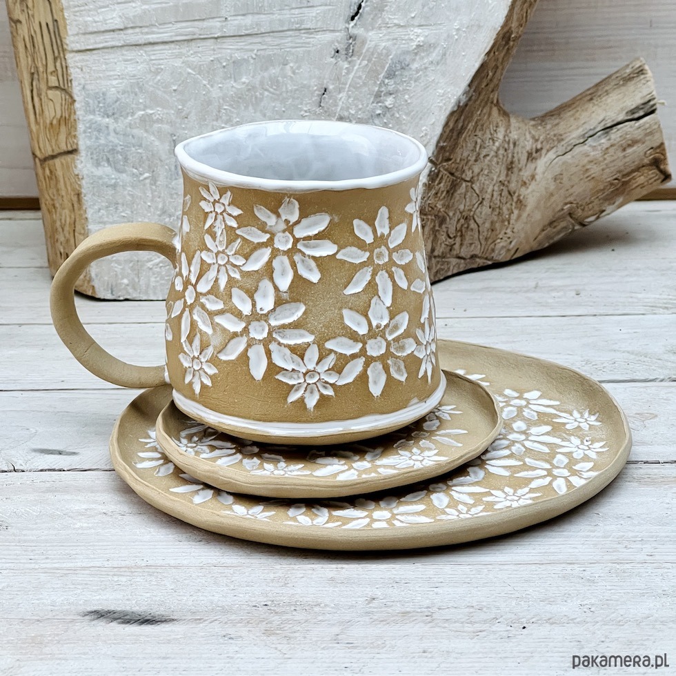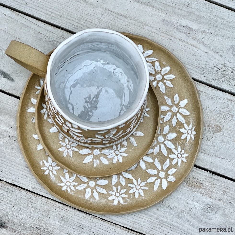Ręcznie wykonany, ceramiczny zestaw śniadaniowy z motywem zimowych margerytek. Zestaw składa się z kubka o pojemności około 300 ml, spodka o średnicy około 10 cm i talerza o średnicy około 17 cm. Kubek jest idealny do gorących i zimnych napojów, ma lekko wyoblone dno dla wygodnego trzymania na dłoni. Brzeg jest tak skonstruowany, że zapobiega ściekaniu płynu podczas picia. Nieszkliwione ucho zapewnia pewny i wygodny uchwyt. Tekstura jest miła w dotyku. Spodek położony na kubku pomaga utrzymać temperaturę podczas zaparzania herbaty lub kawy. Talerz zmieści tosty lub sałatkę. Naczynia są lekkie i wytrzymałe, ale tłukące, jak to ceramika.