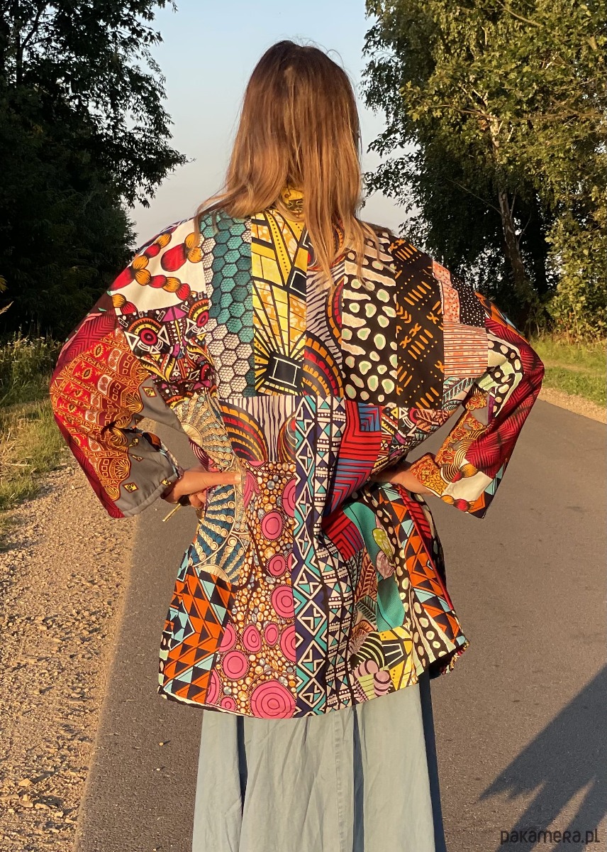 To unikatowe, ocieplane kimono patchwork, stworzone z bawełnianych tkanin z różnych zakątków Afryki. Każdy egzemplarz jest niepowtarzalny. W środku znajduje się naturalna podszewka z jednokolorowego muślinu, co zapewnia komfort noszenia. Kimono ma wygodne, proste rękawy i praktyczne kieszenie. Dzięki możliwości noszenia dwustronnie, zyskujesz dwie różne stylizacje w jednym. Uszyte w Polsce, idealne na wiosnę – lekka alternatywa dla klasycznej kurtki, która doda Twoim stylizacjom wyjątkowego charakteru.