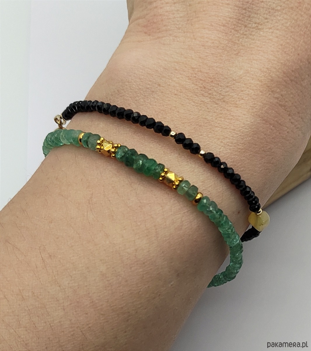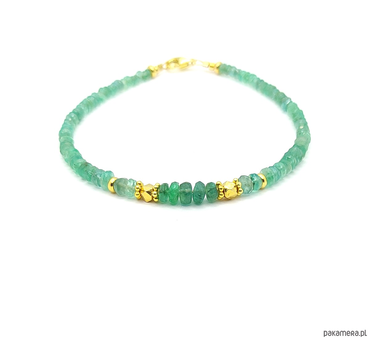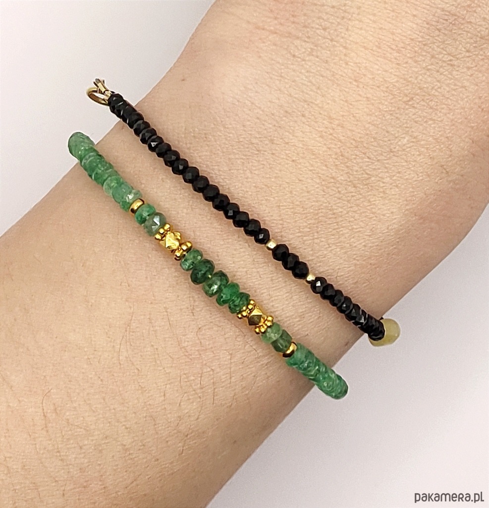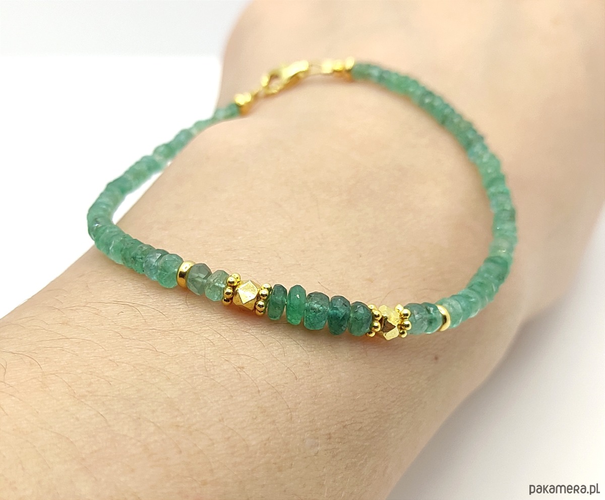 Wyjątkowe kamienie prawdziwego szmaragdu. W pięknym zielonym odcieniu, dodatkowo podkreślonym przez dodatki z pozłacanego srebra. Do tej bransoletki zostały wykorzystane lekko nieregularne oponki, które są ułożone wg rozmiaru (2,5-4 mm). Największe okazy znalazły się na środku. Są to szmaragdy pochodzące z kolumbijskich złóż, mają nasyconą barwę. Pozostałe, jaśniejsze kamienie, zostały wydobyte w Brazylii.