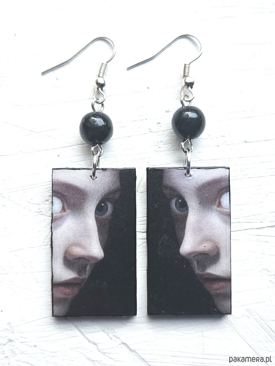 kolczyki drewniane, ozdobione metodą decoupage, dwustronne, starannie wykończone farbami akrylowymi i zabezpieczone wielokrotnie lakierem, drewniane koraliki, bigle posrebrzane, długość kolczyków bez bigli: 5 cm, szerokość: 2 cm, bardzo lekkie