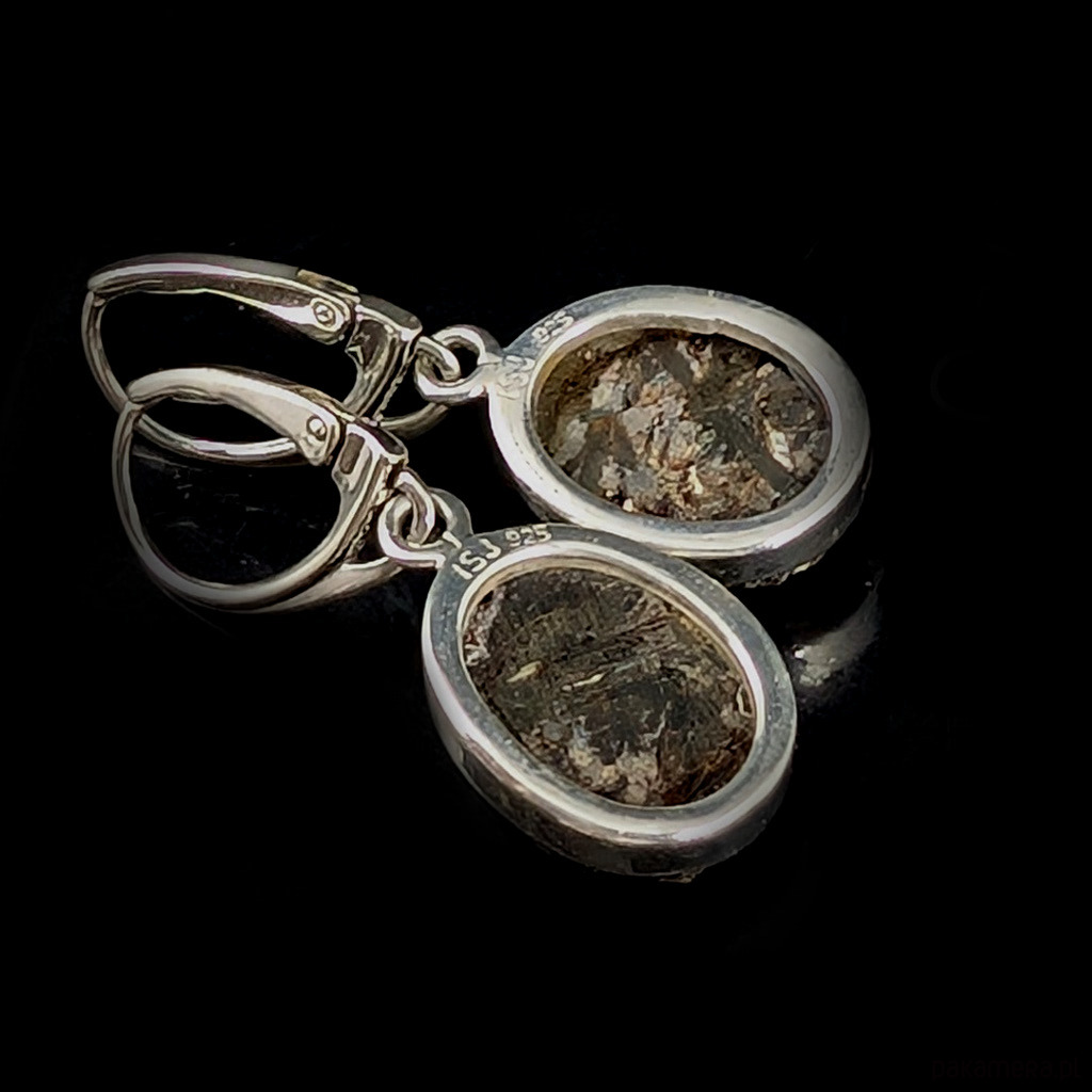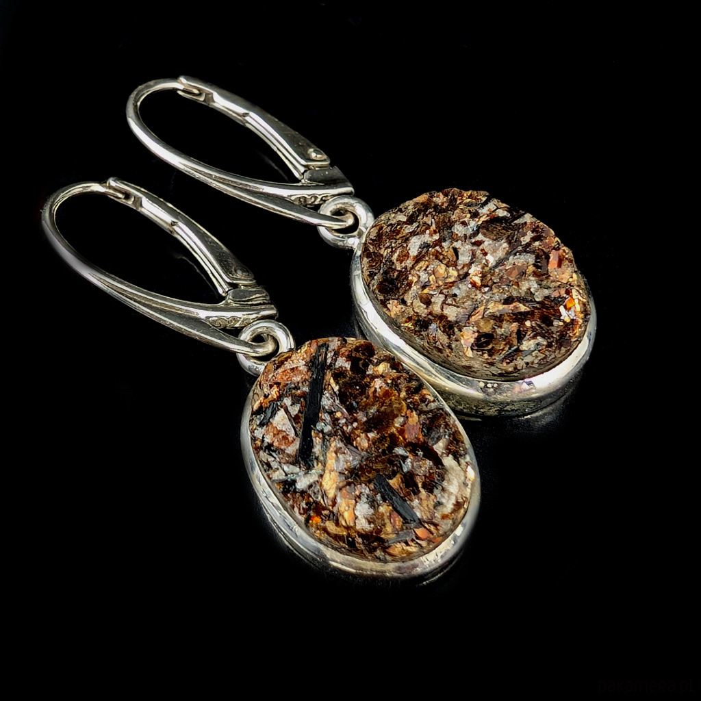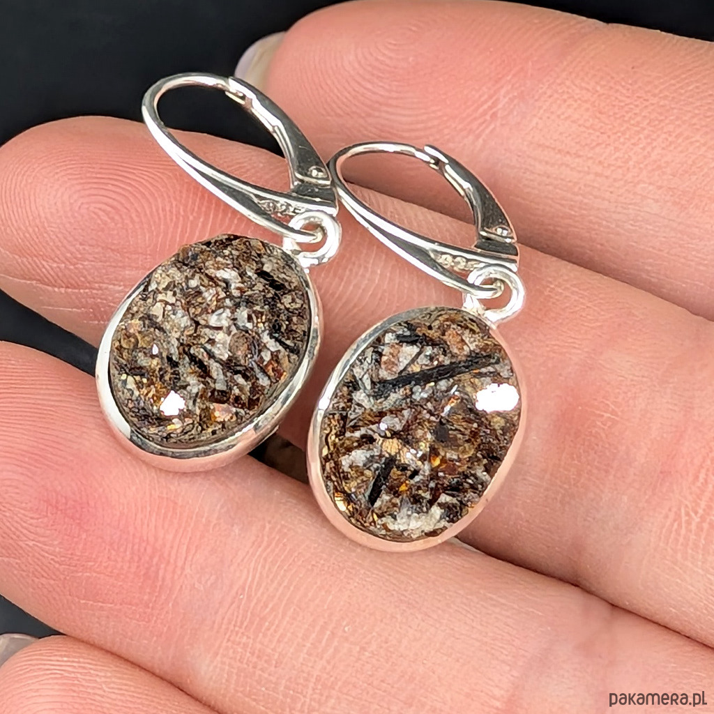 Astrofility oprawione w srebro pr. 925, oksydowane i mocno przecierane. Waga jednego 3,5 grama. Wymiary całej oprawy 16 x 13 mm. Z biglami długość 33 mm. Powierzchnia kamienia o ciekawej strukturze, miejscami ze złocistymi igłami minerałów. Niezwykłe zjawisko,nie do ukazania na zdjęciu. Wykonane przez dostawcę kamieni