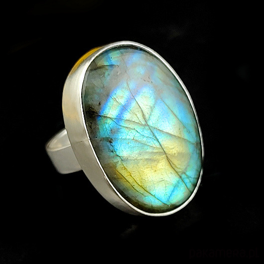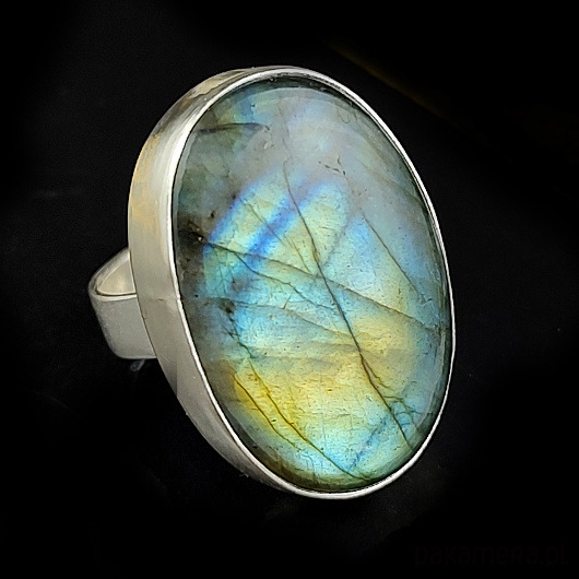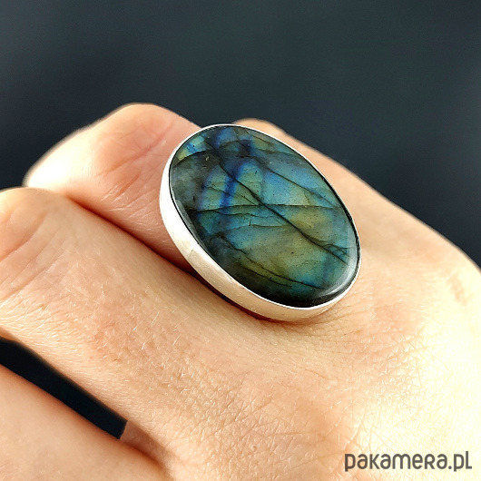 Okazały pierścień z oprawionym w srebro próby 925 naturalnym labradorytem o zjawiskowych odcieniu niebieskiego, granatu i zlota. Wymiary całej oprawy kamienia 28 x 20 mm. Waga 12,8 g, rozmiar jubilerski 12, mogę powiększyć odrączkę do rozmiaru max. 18. Zapakowany do wysylki w ozdobne pudełeczko.