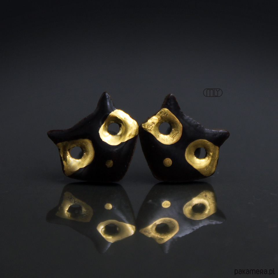 Efektowne kolczyki w formie sztyftów, ręcznie wykonane z delikatnej gliny kamionkowej, jednostronnie szkliwione czekoladowobrązowym szkliwem z efektem plamek, dekorowane złotem,na antyalergicznych sztyftach w kolorze srebrnym. długość elementu ceramicznego ok. 11mm, Polecam