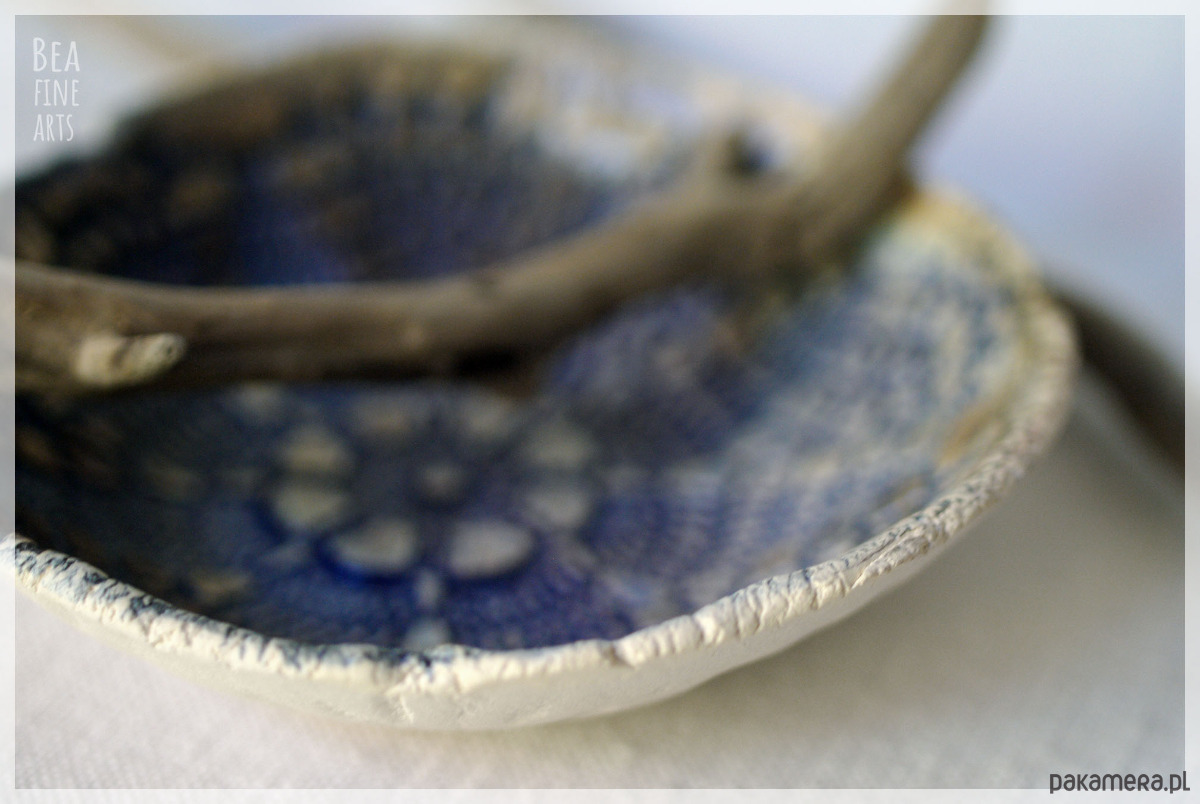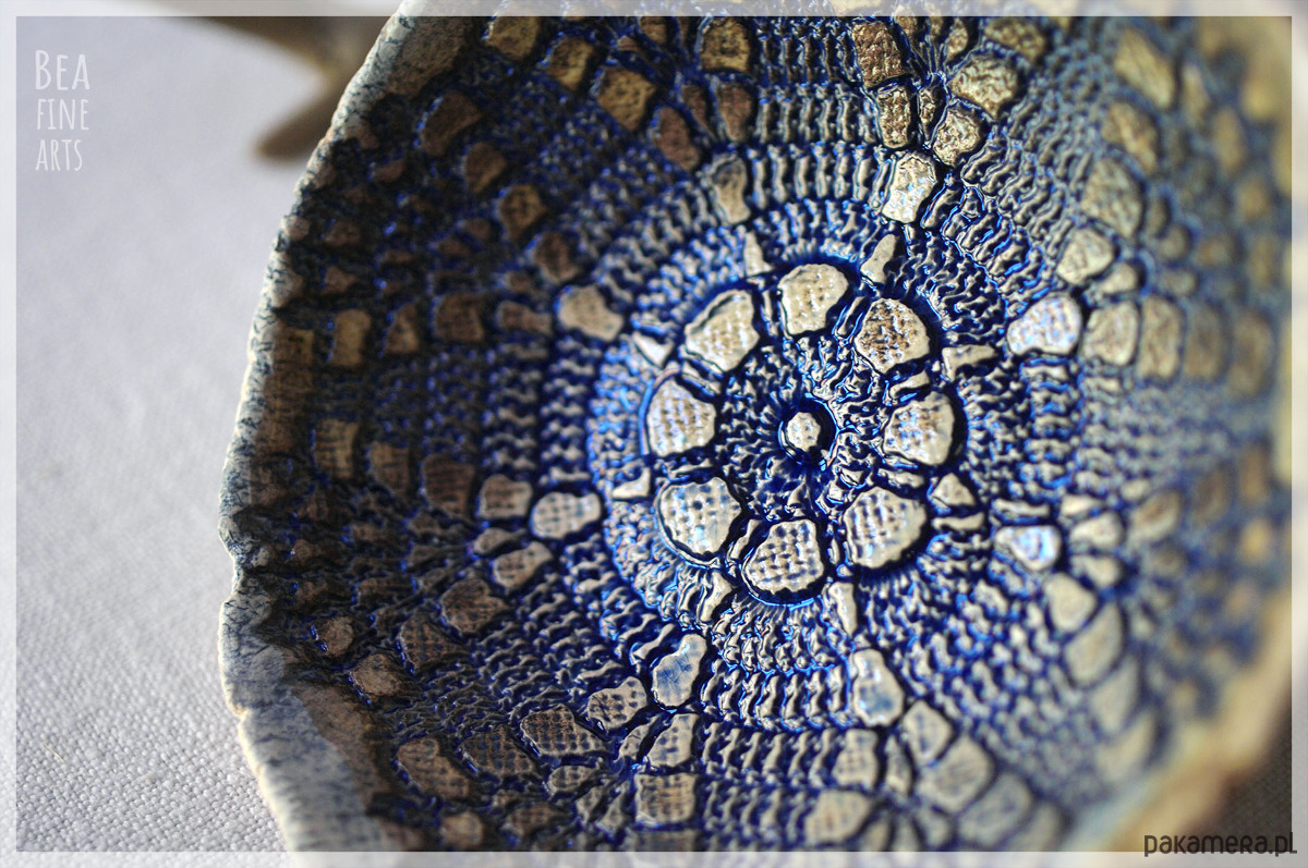 Śliczna niewielka miska ceramiczna o nieregularnym kształcie, z motywem granatowej koronki na złocistym tle, z surowymi brzegami.