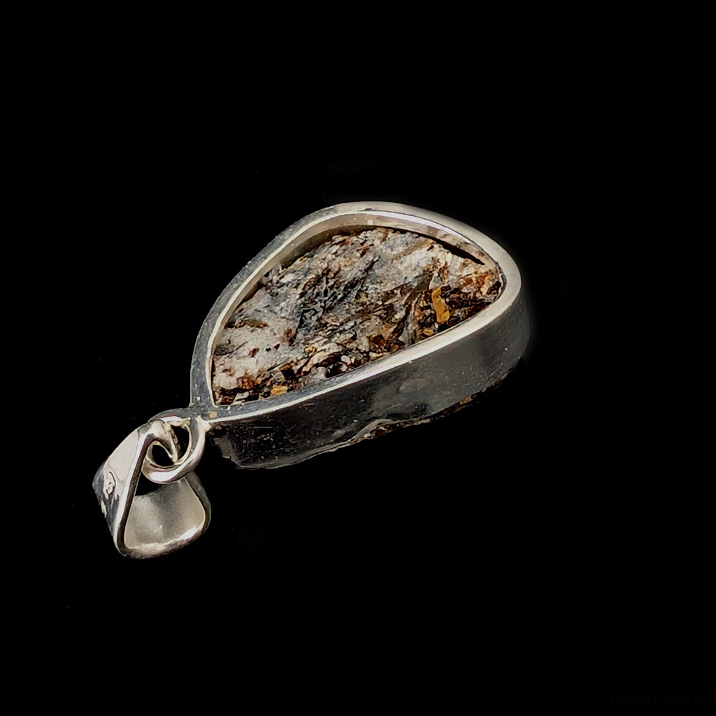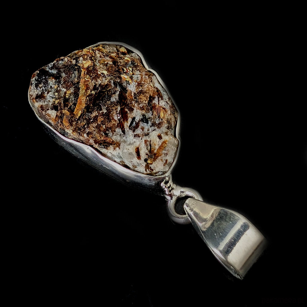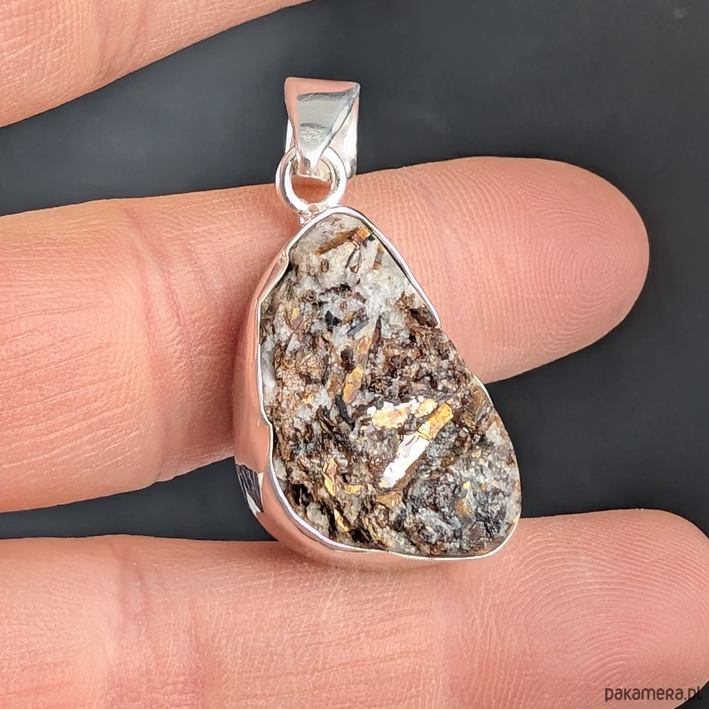 Zjawiskowy, naturalny astrofilit oprawiony w srebro pr. 925. Waga 8 gramów. Wymiary całej oprawy 24 x 17 mm. Z krawatką dłuość 38 mm. Powierzchnia kamienia o ciekawej strukturze, miejscami ze złocistymi i czerwonymi igłami minerałów. Niezwykłe zjawisko,nie do ukazania na zdjęciu. Wykonany przez dostawcę kamieni.