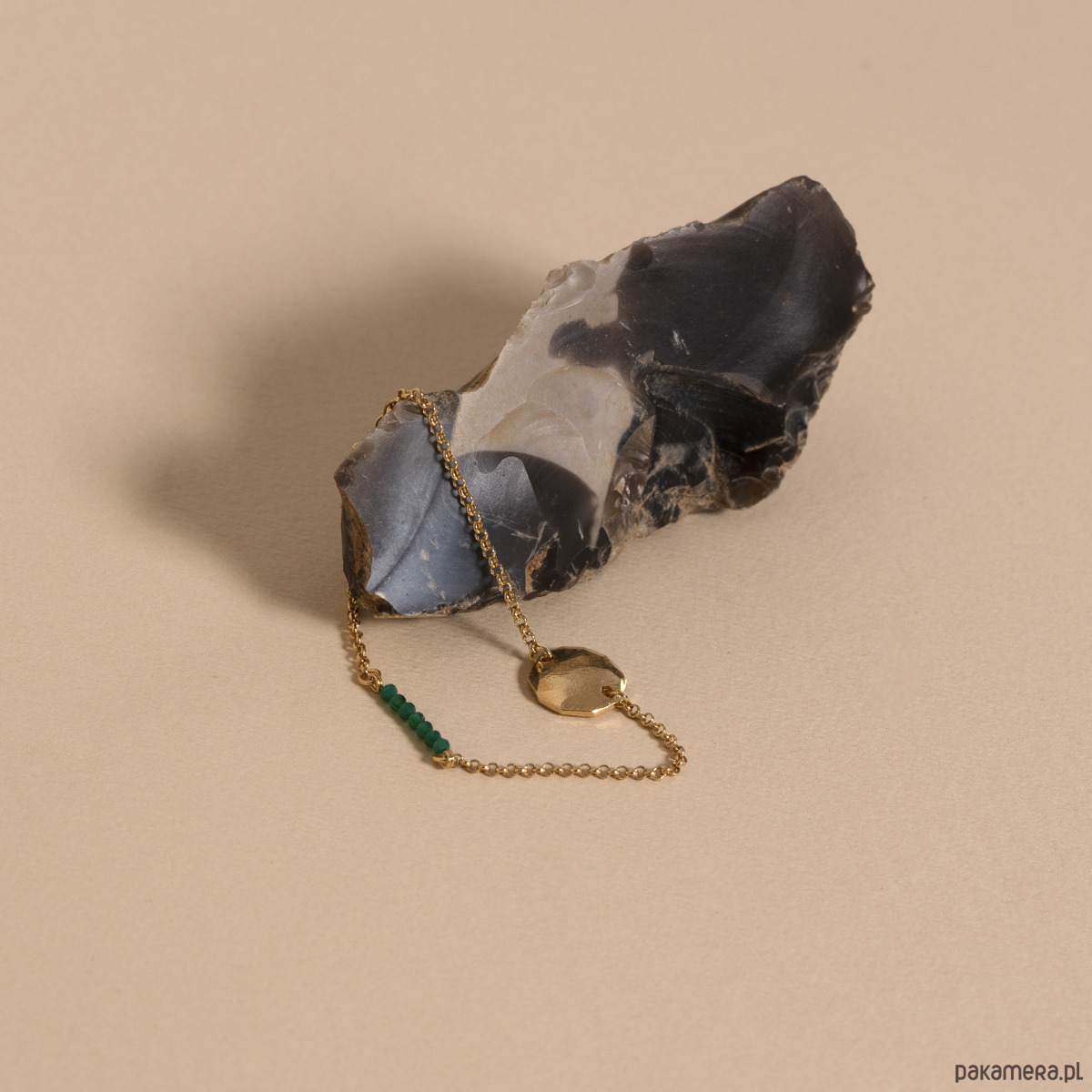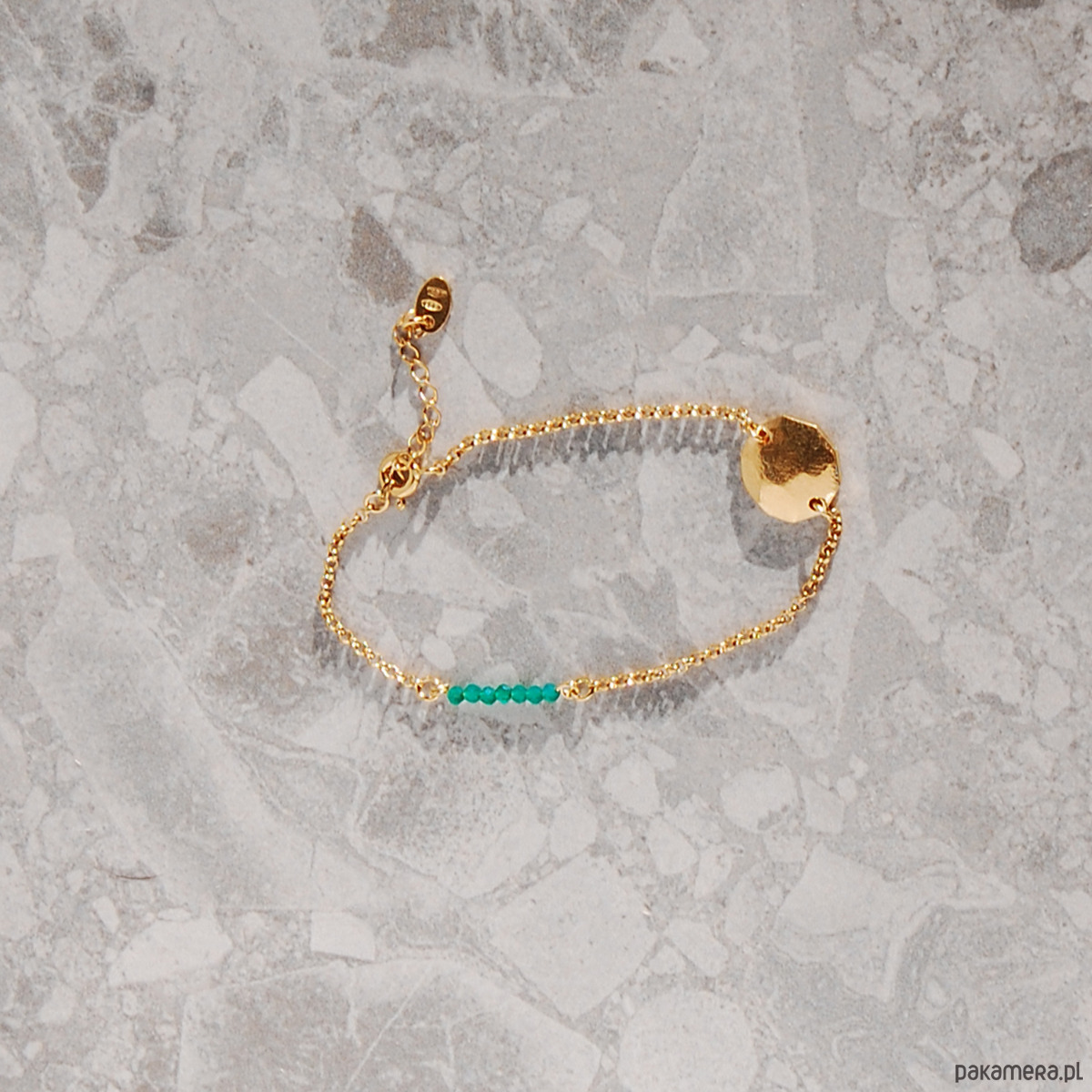 Delikatna bransoletka, której podstawą jest złocony łańcuszek ze srebra próby 925 ozdobiony drobnymi kamieniami naturalnymi- onyksem zielonym.