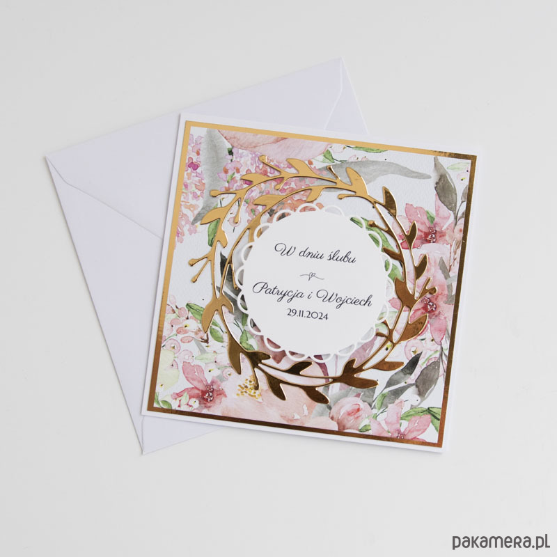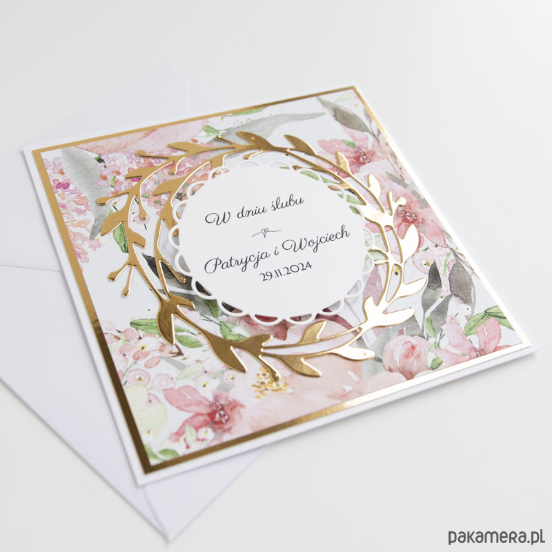 Ręcznie robiona kwiatowo złota kartka ślubna.